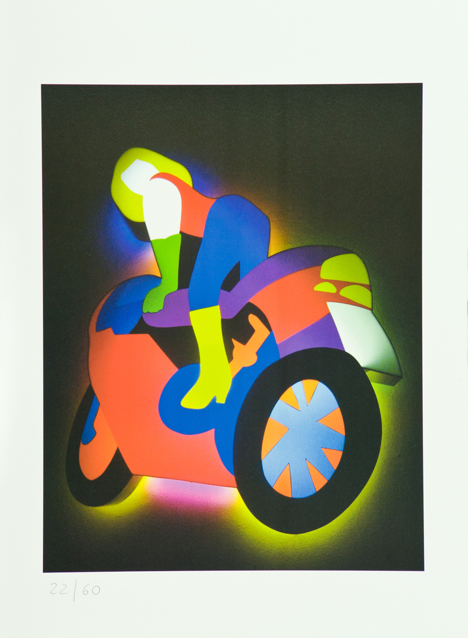 Marco Lodola Lotto unico di due Opere - "Pin up", Litografia su carta, cm. 48x34, es. 29/70, firma in basso a destra, tiratura in basso a sinistra; - "Moto, Litografia su carta, cm. 48x34, es. 22/60, tiratura in basso a sinistra.