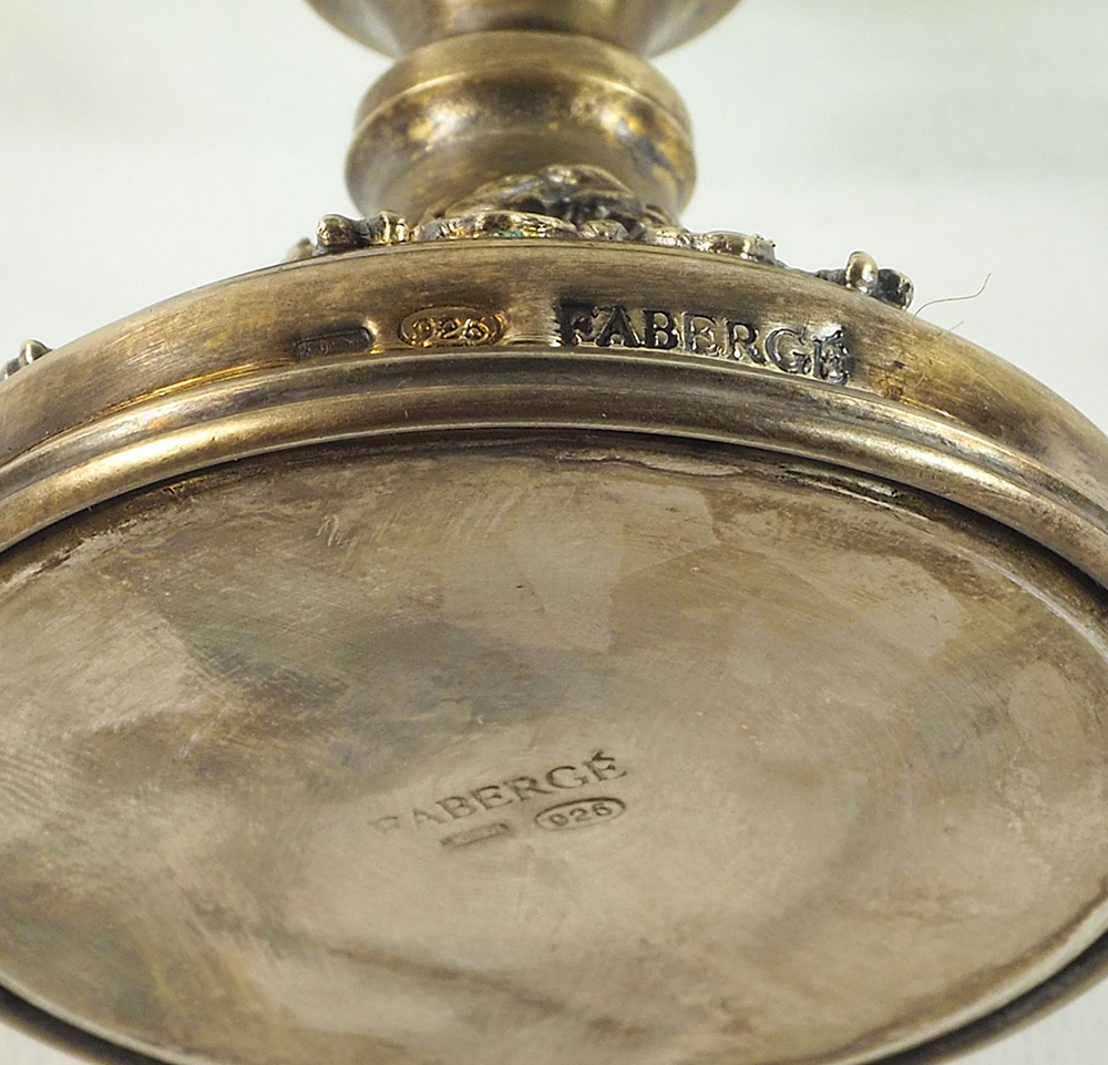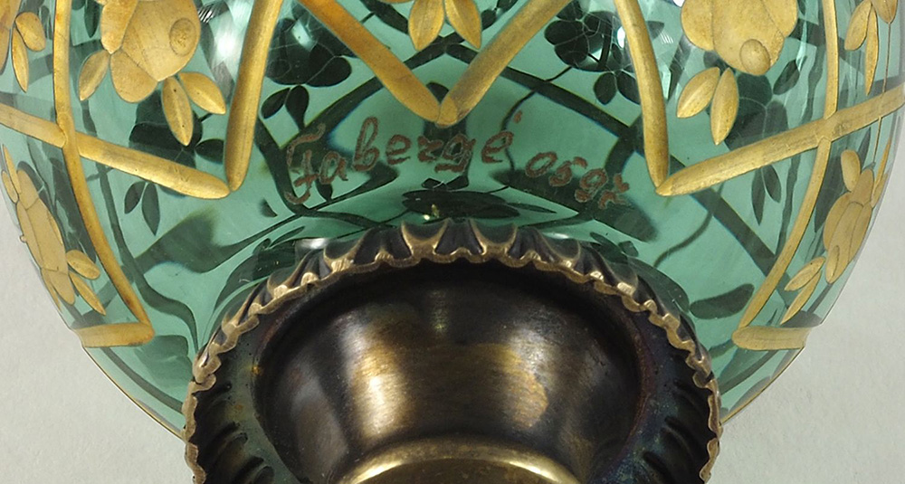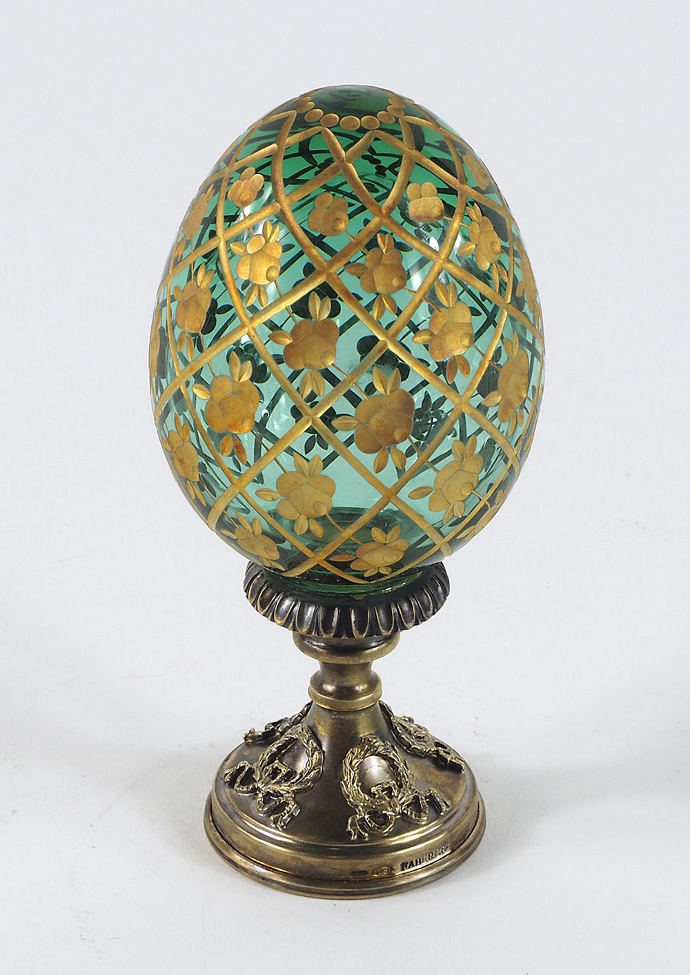 Uovo in vetro verde con decori dorati, su piedistallo. Entro custodia originale Fabergè. H. cm. 15.