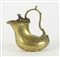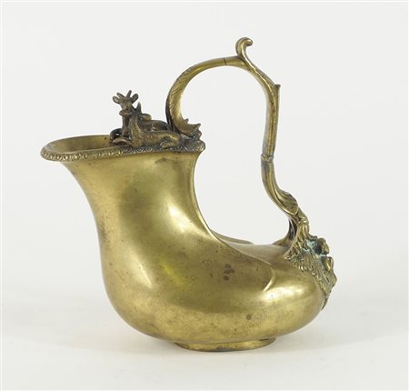 Brocca in bronzo dorato con manico sagomato e figure di animali. H. cm. 21.