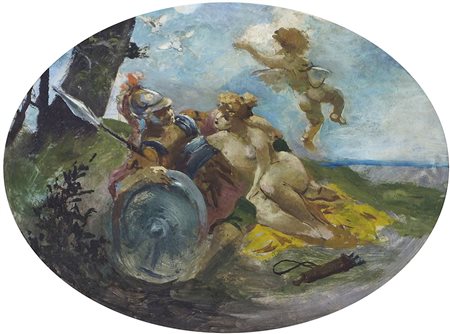 Maestro del XIX secolo "Riposo del guerriero" cm. 22x30 - olio su cartone In b. a s. dedica "all'amico Spaccavalli Nicolò offre" Prov.: collezione Basilio Trieste.