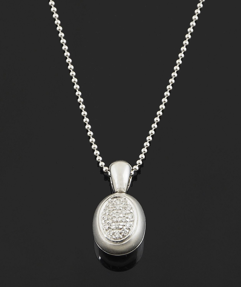 Girocollo a maglia Cartier in oro bianco con pendente ovale lucido e satinato con incassati diamanti taglio brillante per ca tot ct 0,15