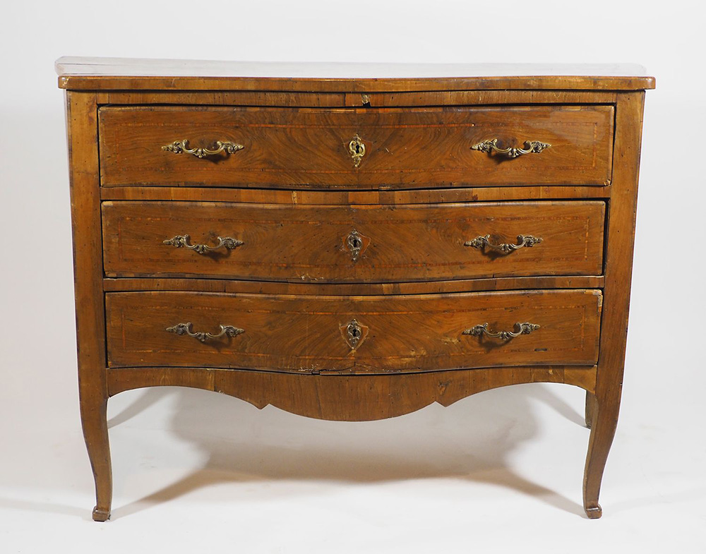 Cassettone in legno a 3 cassetti con fronte bombato, intarsi a filettature in...