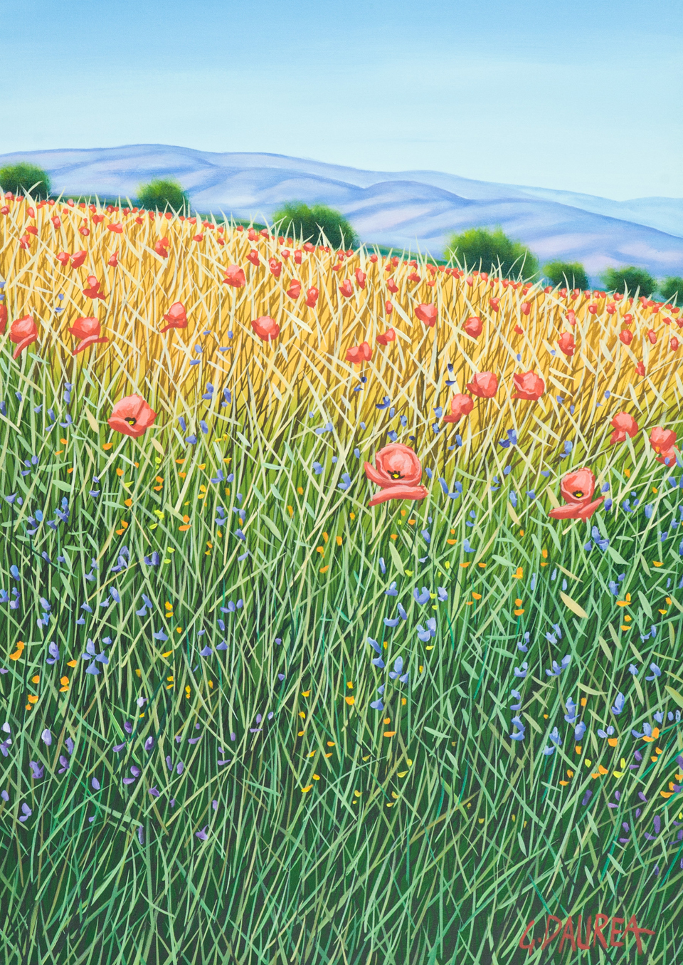 Giovanni Daurea Campo di papaveri Olio su tela, cm. 70x50 Firmato in basso a destra. Sul verso: firma. Autentica dell'Artista su foto.