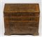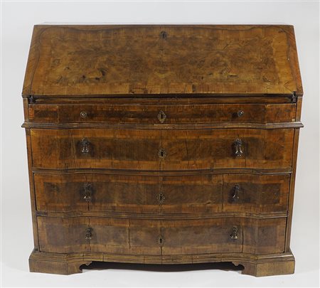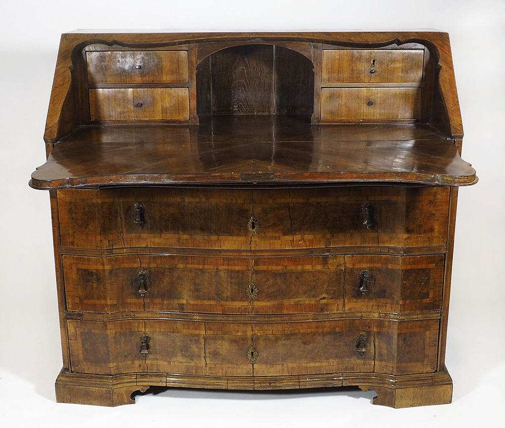 Cassettone in legno a 3 cassetti e calatoia, intarsi in legni vari, fronte leggermente bombato. XVIII secolo. cm. 109x116x56. (restauri).