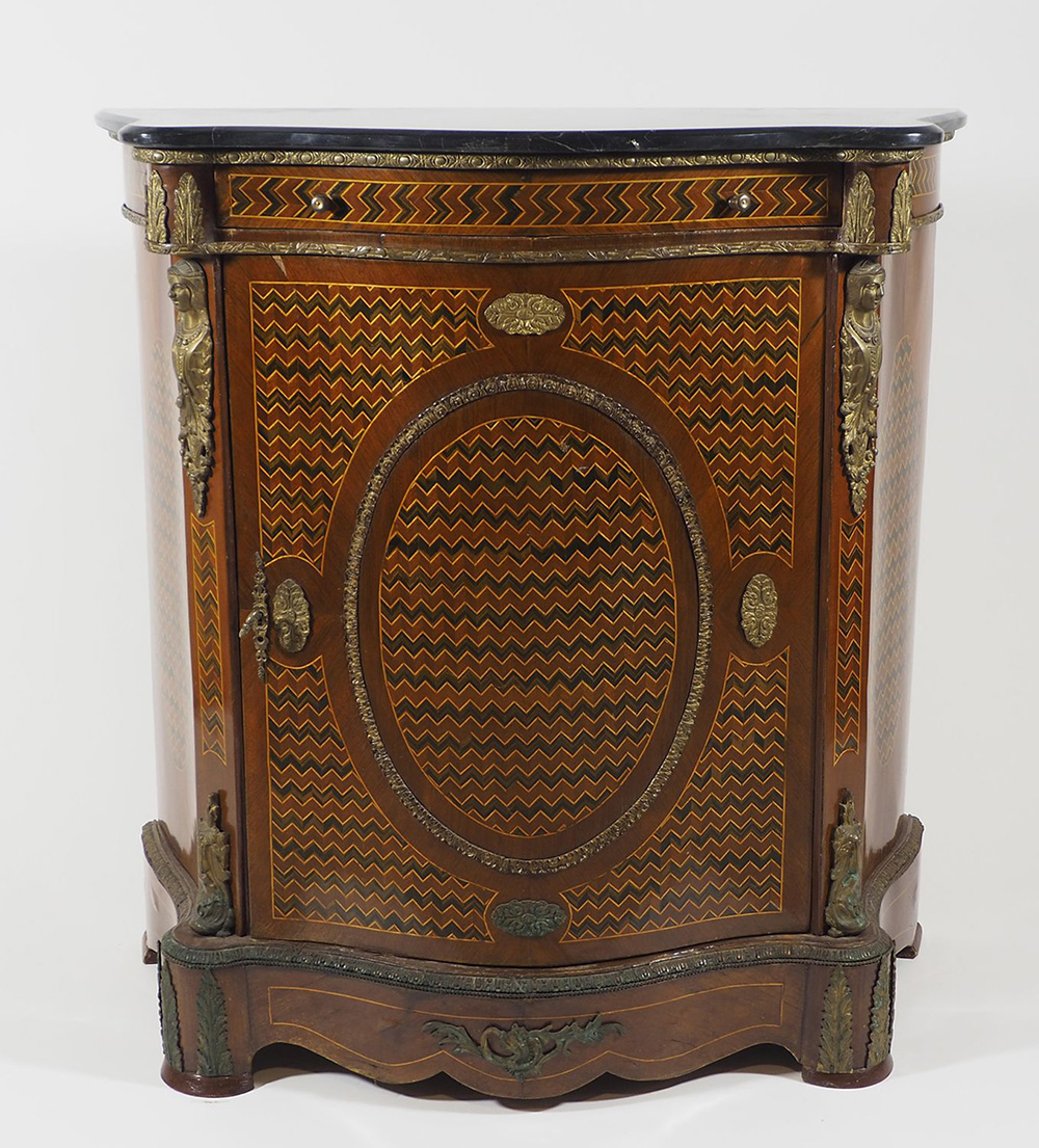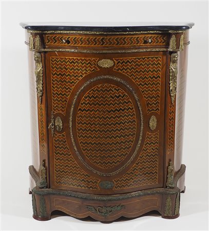 Credenza danese in legno con intarsi in legni vari e anta centrale, fronte bombato e piano in marmo nero. cm. 100x93x43.