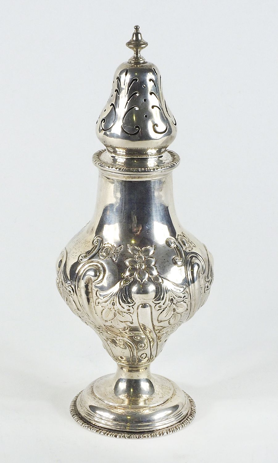 Spargizucchero in argento sbalzato a motivi floreali. Punzone Chester 1906. H. cm. 25. gr. 260.
