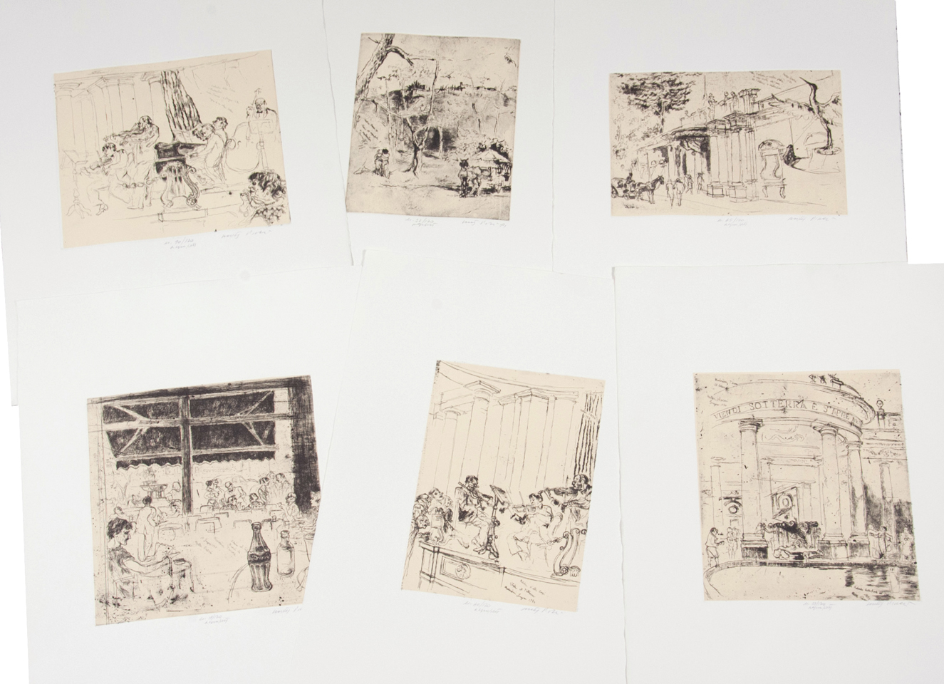 Walter Piacesi Immagini di Montecatini Terme d'Europa Cartella contenente cinque acqueforti, ciascuna di cm. 33x28 c.a., su carta di cm. 70x50, es. vari, tutte firmate in basso a destra e tirate in basso al centro.