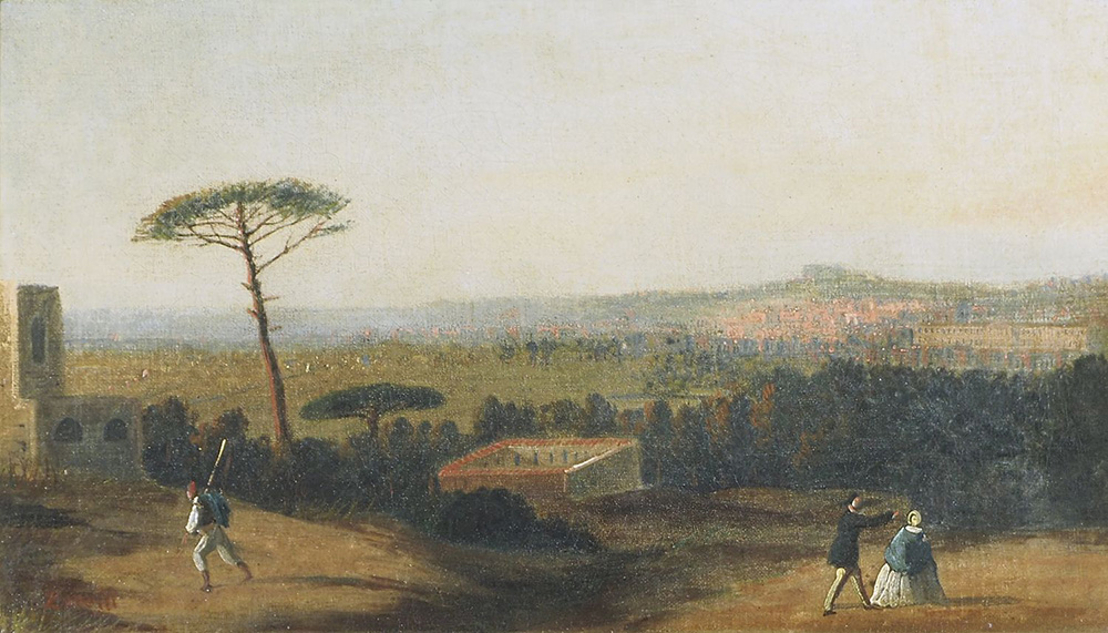 Pittore primi '900 "Campagna romana con cacciatore" cm. 19x34 - olio su tela su faesite