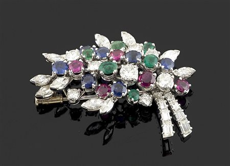 Spilla floreale " fantasia" in oro bianco con zaffiri, rubini, smeraldi e diamanti taglio brillante per tot ca ct 1,50 e taglio marquise e baguette per tot ca ct 2,5