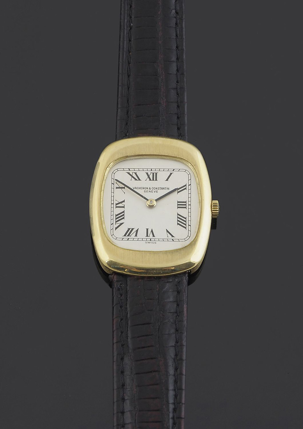 Vacheron & Constantin: orologio da polso da uomo con cassa rettangolare in oro giallo, quadrante con numeri romani.