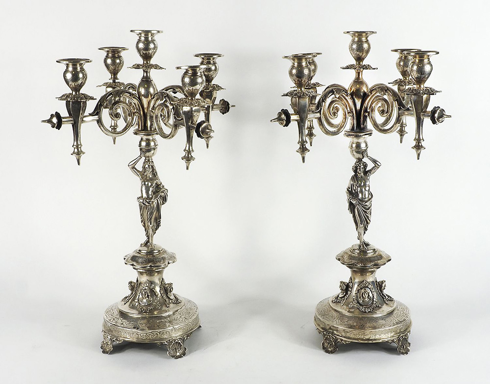 Paio di grandi candelabri in argento sbalzato e inciso a 5 fiamme sorrette da figura femminile, base incisa a motivi floreali. Austria, XIX secolo. H. cm. 55. gr. 4450.