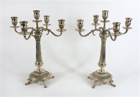 Paio di candelabri in agento a 5 fiamme su colonne scanalate e zampe ferine....