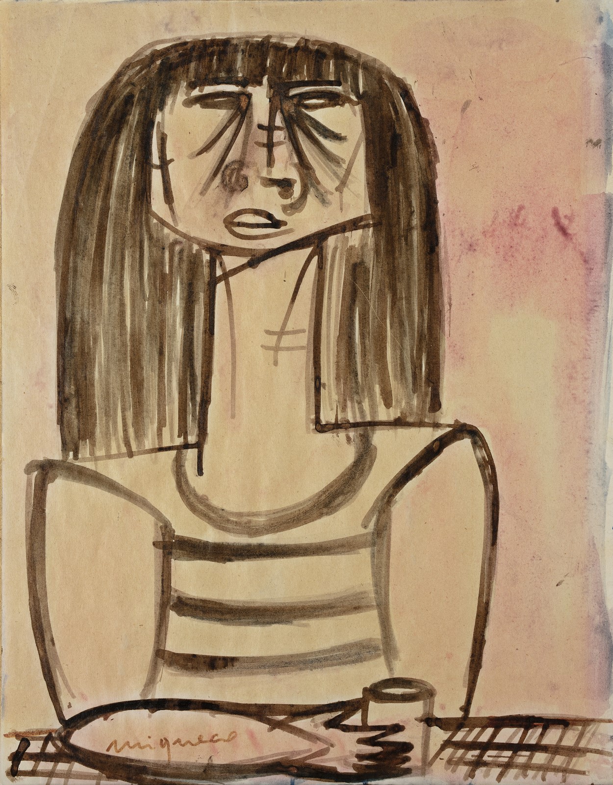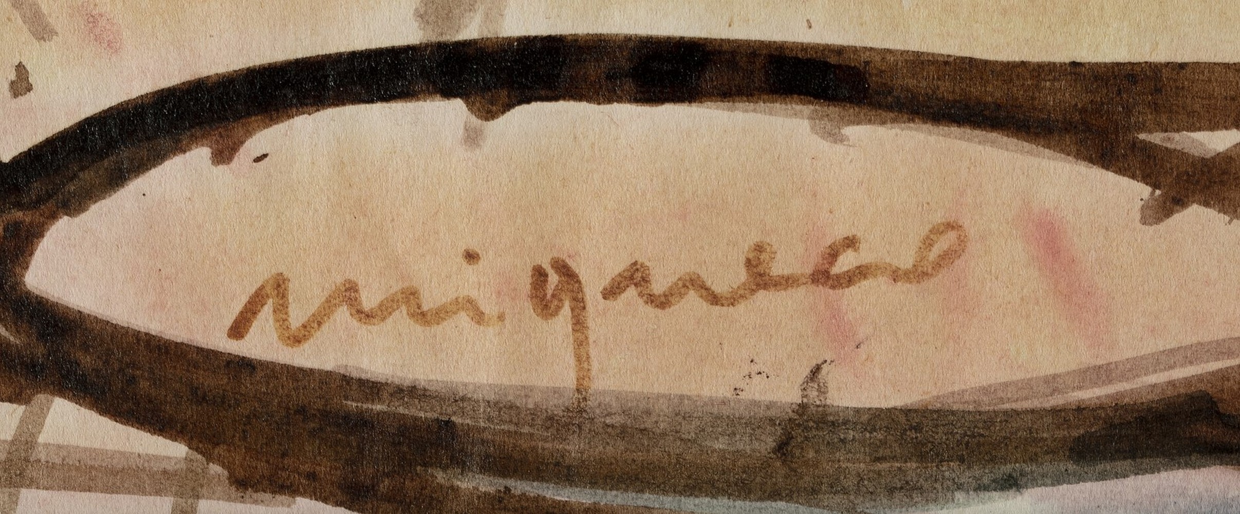 MIGNECO GIUSEPPE (1908 - 1997) Figura. Acquarello su carta. Cm 22,00 x 28,50. Firma in basso a sinistra. Pubblicazione: Catalogo Fabiani Arte, 15 -18 Settembre 2011, Montecatini Terme (Pt). Cornice presente
