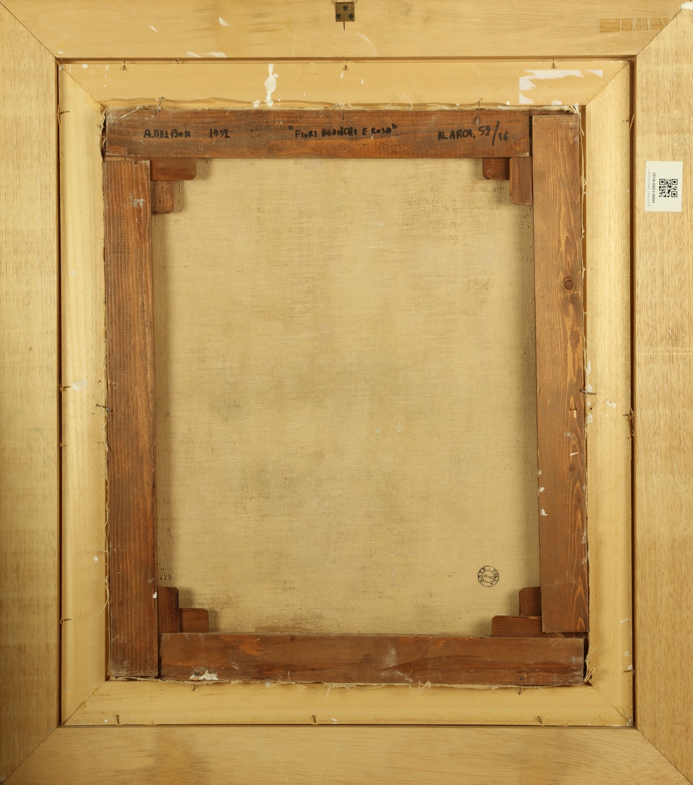 DEL BON ANGELO (1898 - 1952) Fiori bianchi e rose. . 1952. Olio su tela . Cm 52,00 x 61,00. Firma in basso a destra. Al retro titolo, anno e numero di archivio. . Cornice presente