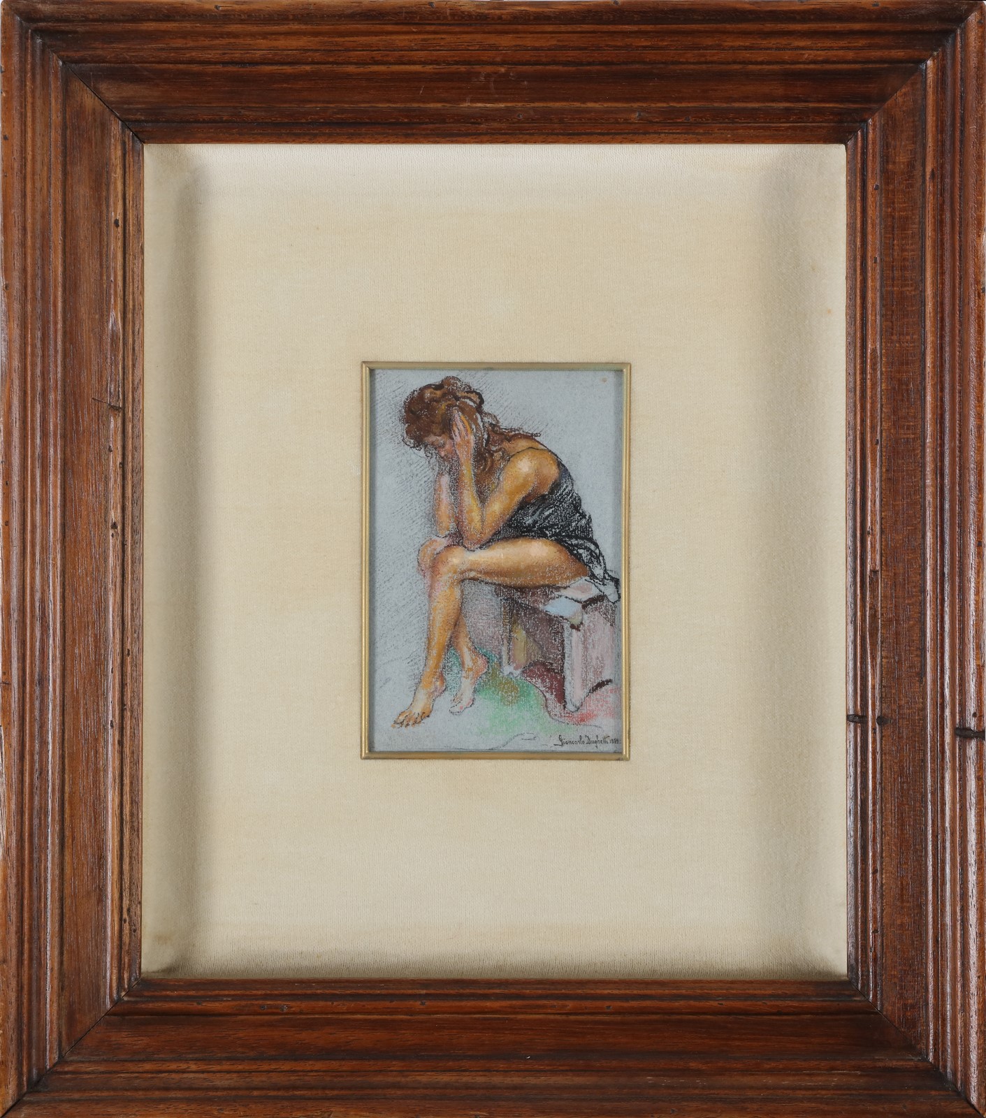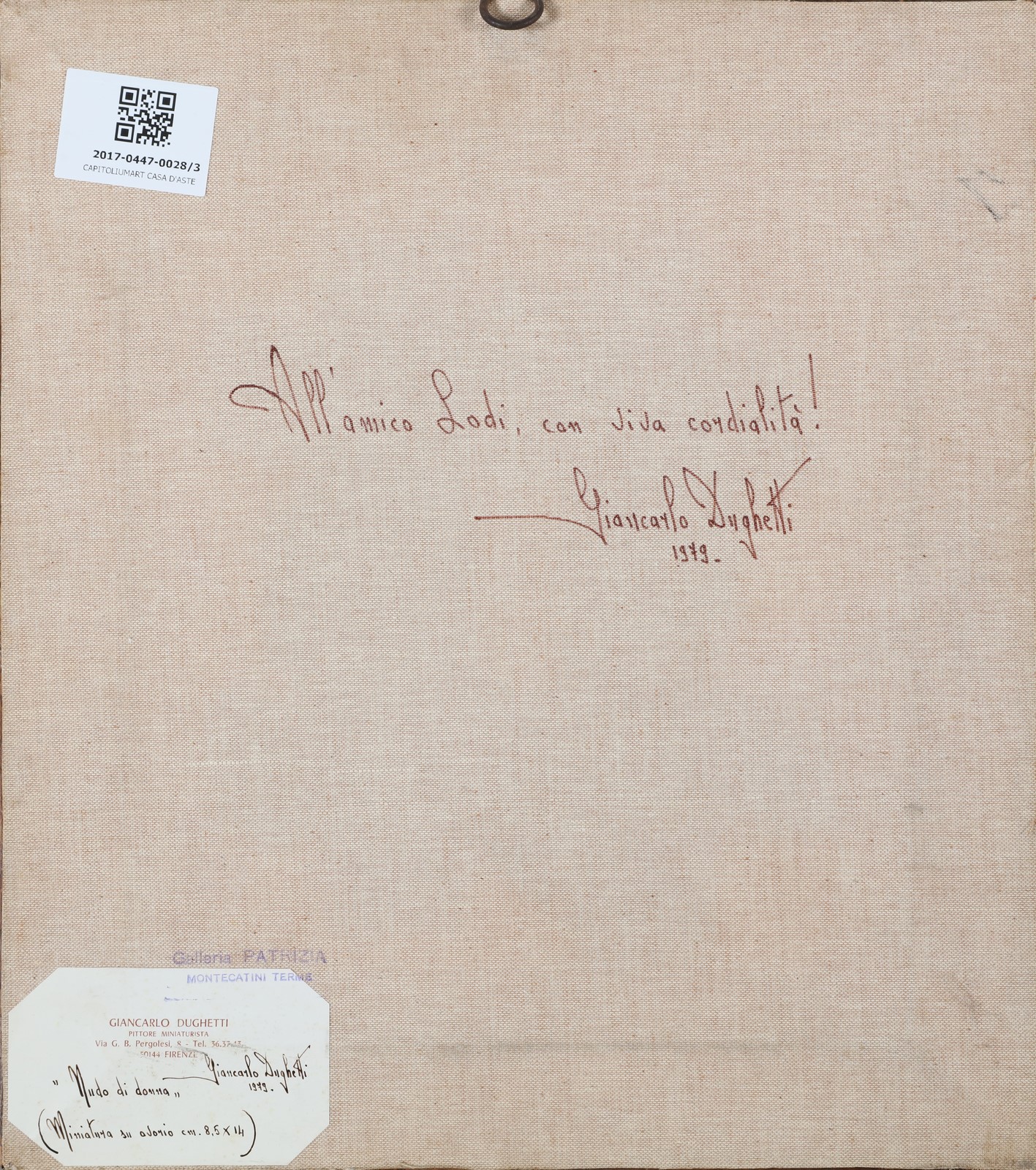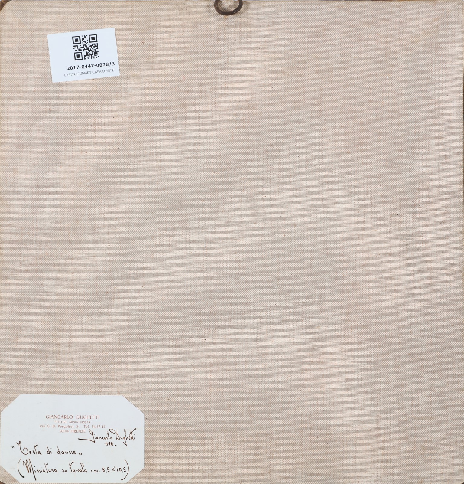 DUGHETTI GIANCARLO (1931 - 1986) Lotto composto da n. 3 miniature. Miniatura. . Testa di donna: miniatura su tavola, firma e anno in basso a destra, 1978, 10x9 cm. Figura di donna: pastello su materiale speciale, firma e anno in basso a destra e al retro, 1979, 15x10cm. Nudo di donna: miniatura su avorio, firma e anno in basso a sinistra e al retro, 1979, 14.5x9 cm. Cornice presente
