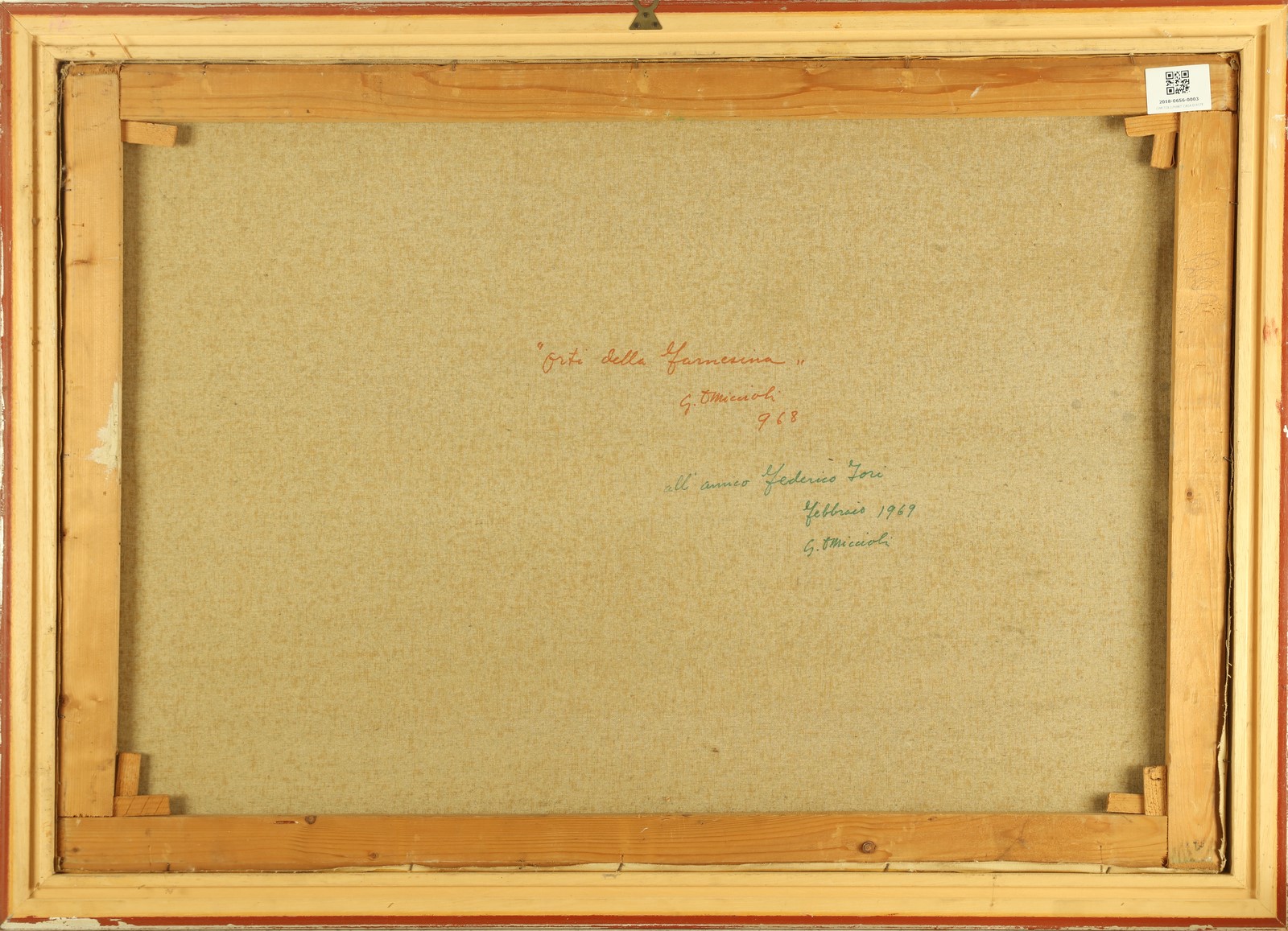 OMICCIOLI GIOVANNI (1901 - 1975) Orti della farnesina. . 1968. Olio su tela . Cm 100,00 x 70,00. Firma in basso a sinistra. Al retro titolo, firma, dedica e anno. . Cornice presente