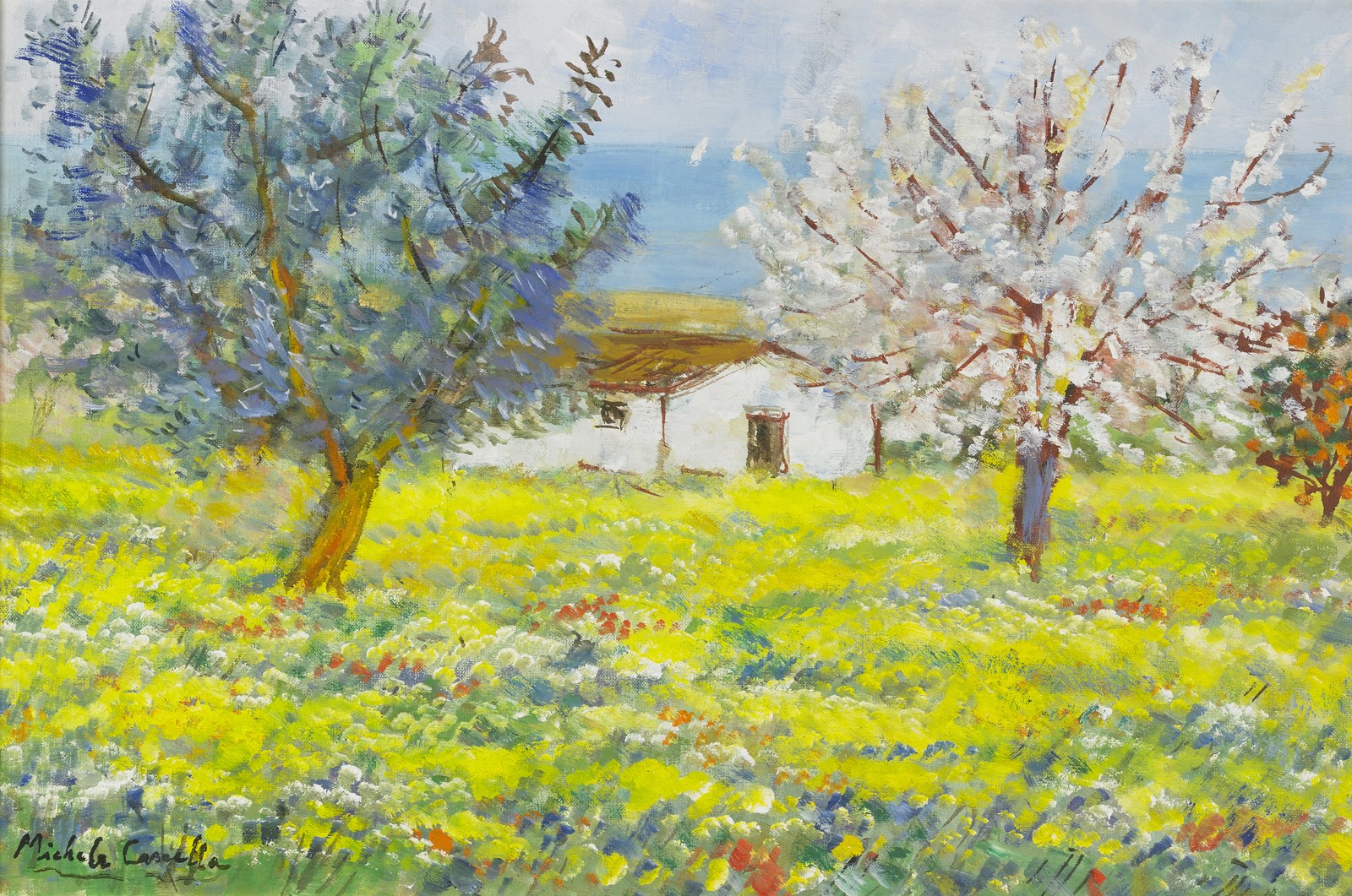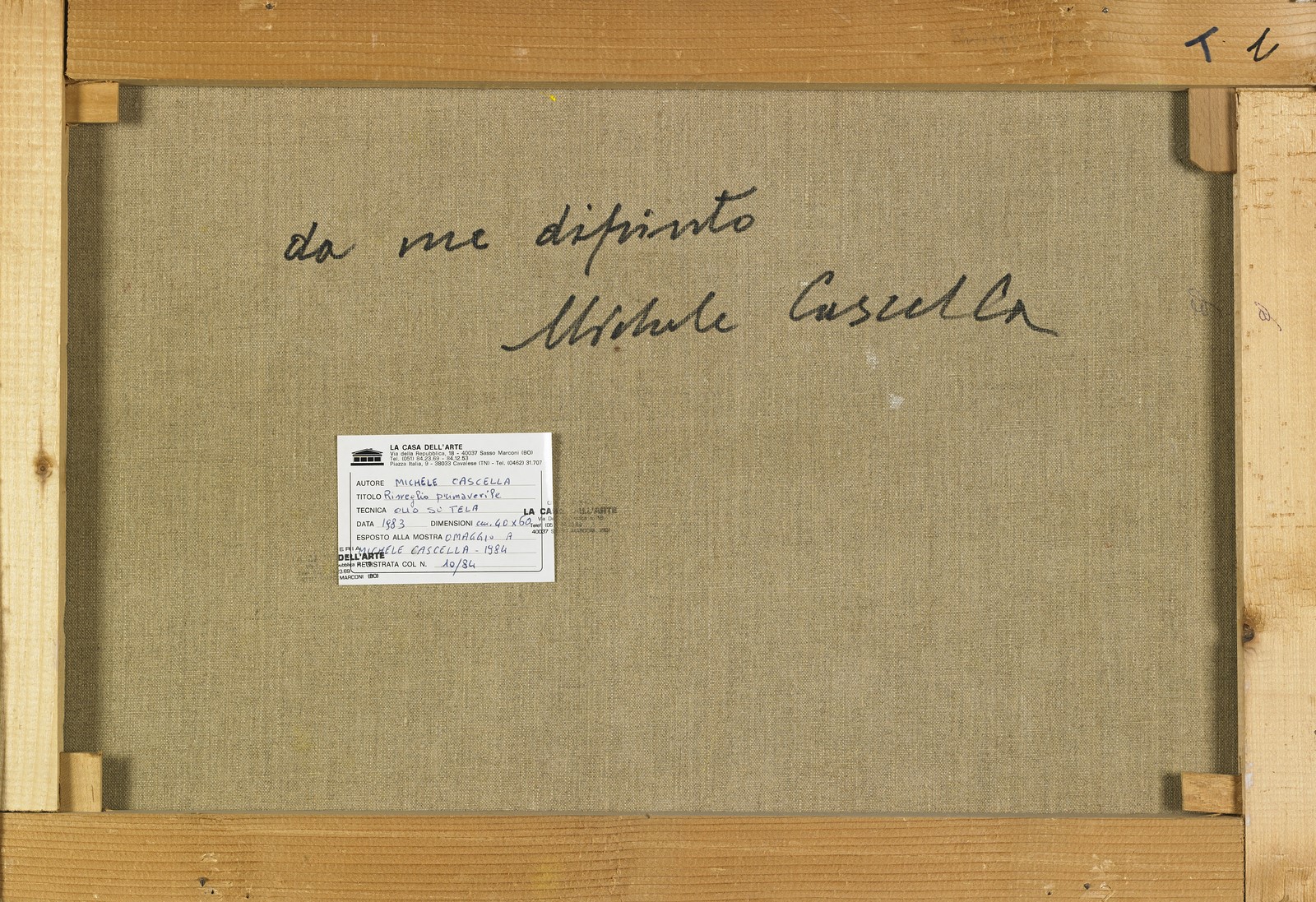 CASCELLA MICHELE (1892 - 1989) Senza titolo. Olio su tela . Cm 60,00 x 40,00. Firma in basso a sinistra. Al retro firma per autentica e cartiglio descrittivo La Casa dell'Arte, Sasso Marconi (Bo). Autentica dell'artista su fotografia. Cornice presente