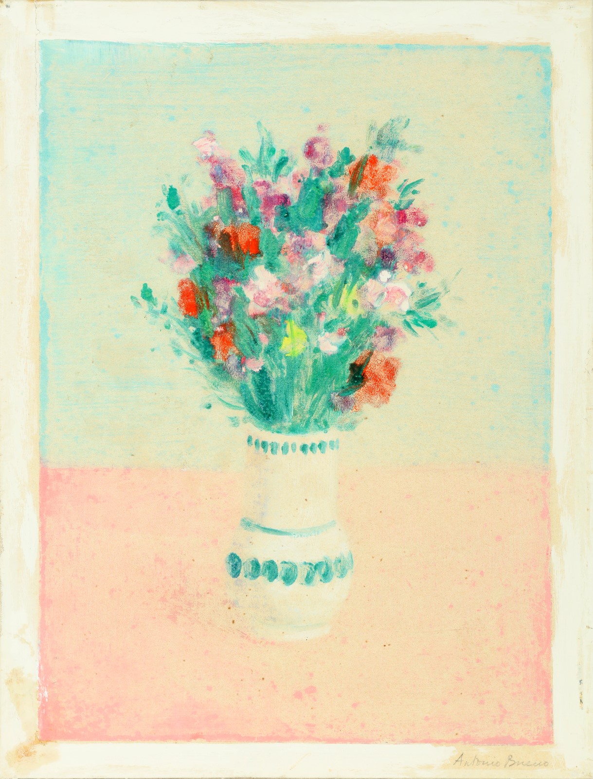 BUENO ANTONIO (1918 - 1985) Vaso di fiori. Tecnica mista su carta su tela. Cm 35,00 x 45,00. Firma in basso a destra. Autentica su fotografia di Isabella Bueno riportante il relativo numero d'inventario. Anni'70. Cornice presente
