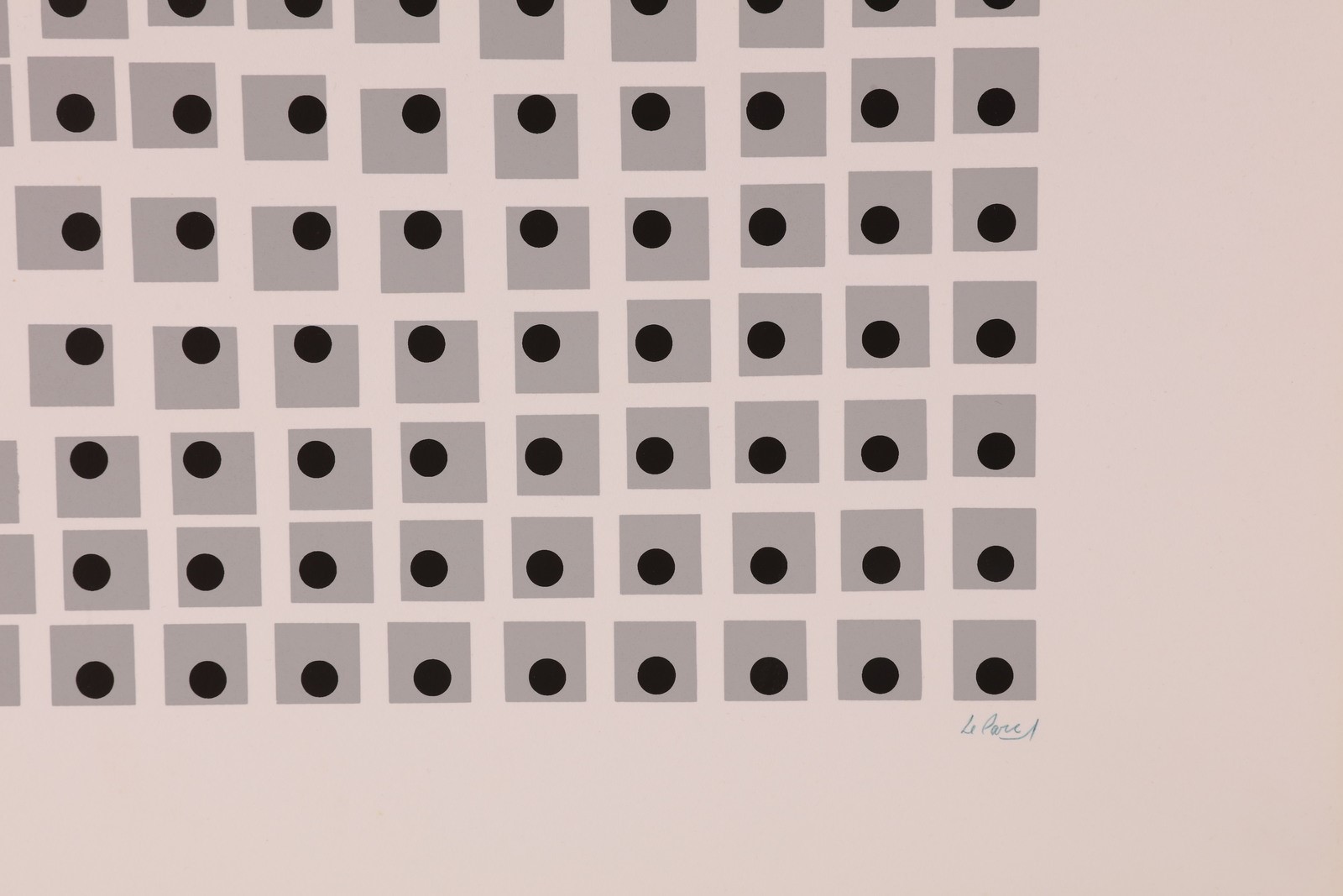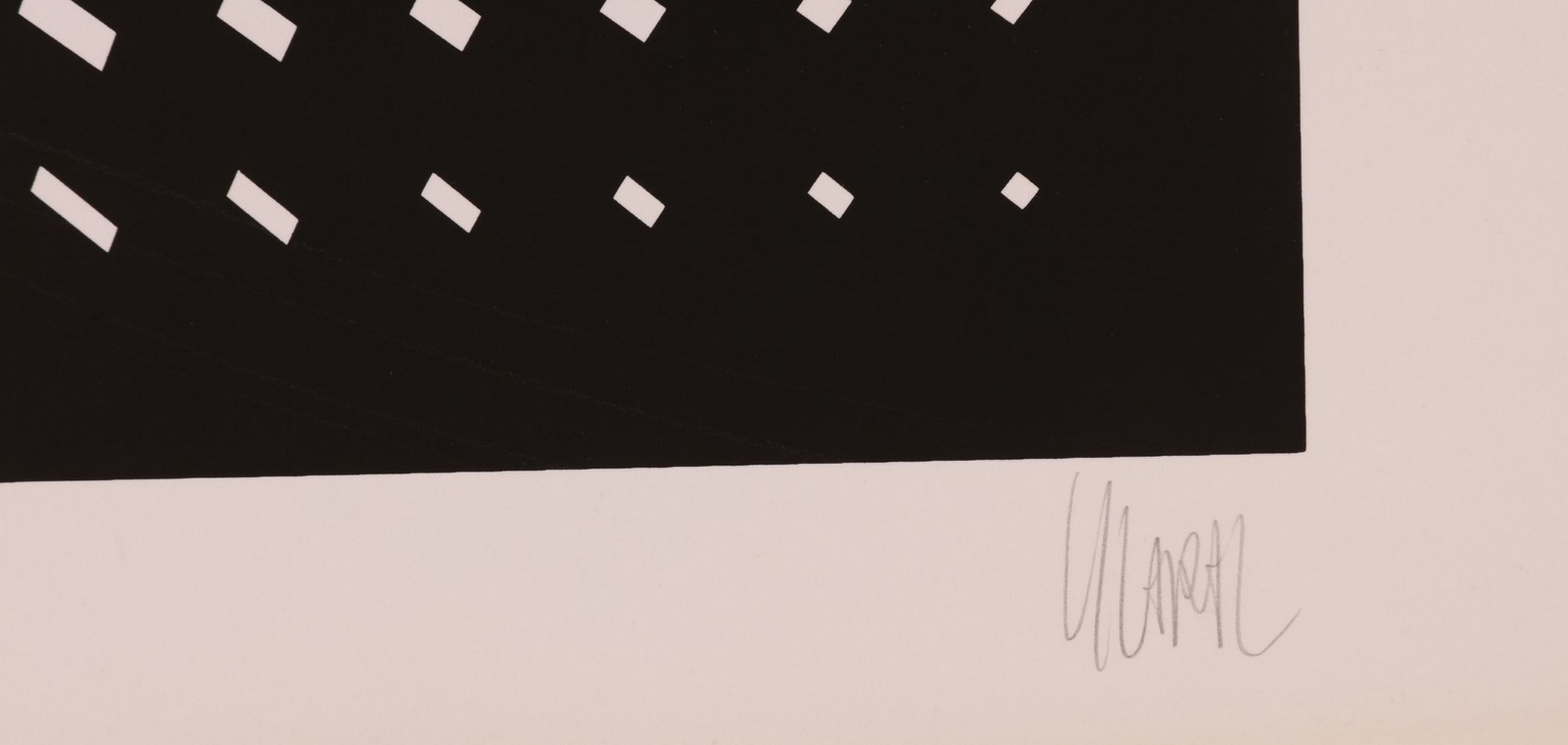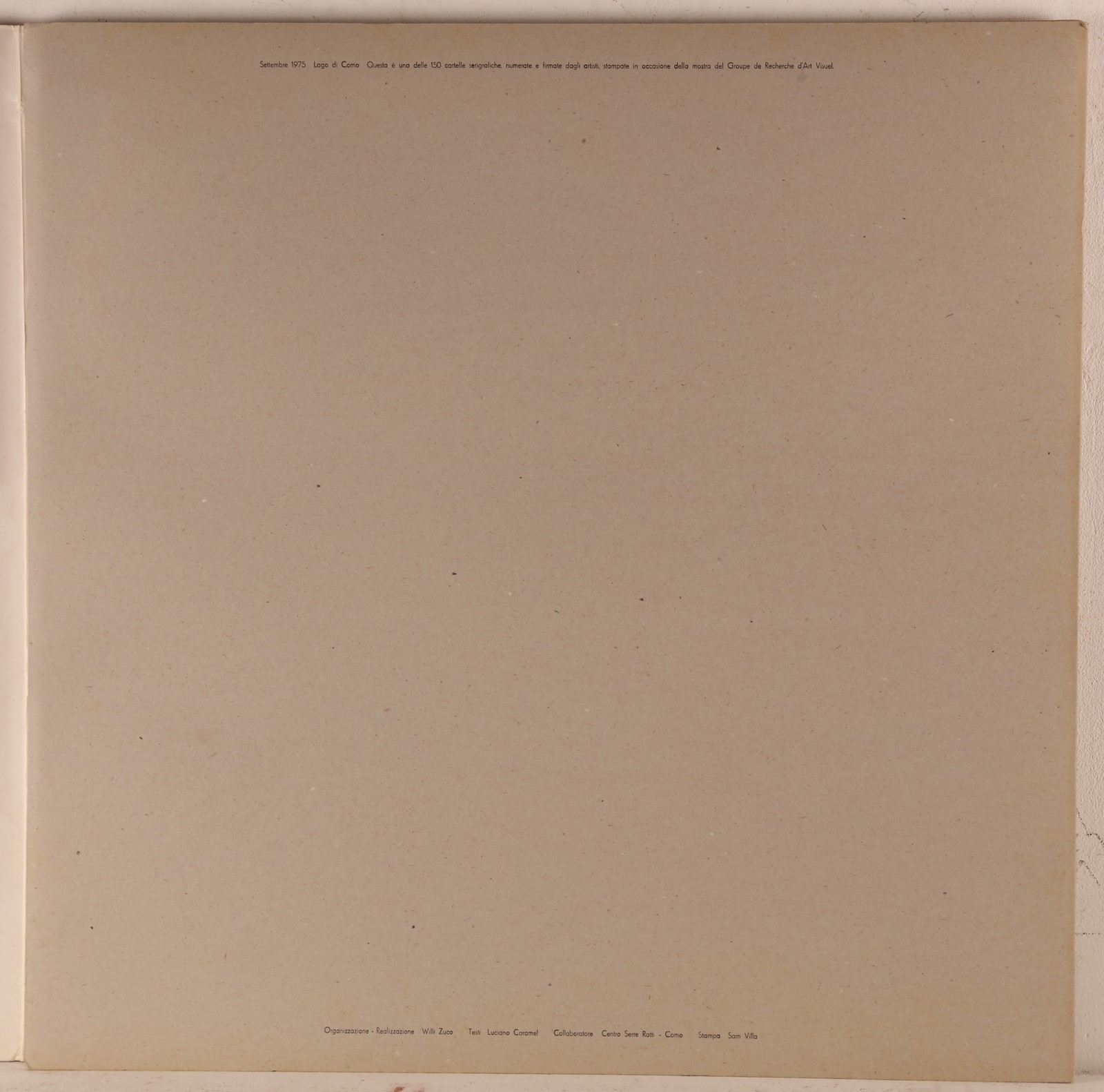 GRAV (Groupe de Recherche d'Art Visuel) Grav, Groupe de recherche d'art visuel 1960-1968 (#6). Silkscreen (complete folder). Cm 70,00 x 70,00. 51/150. Folder realized for the retrospective exhibition of the Groupe de Recherche d'Art Visuel ( Garcia Rossi, Le Parc, Morellet, Sobrino, Stein, Yvaral), Como Lake, September 1975, curated by Luciano Caramel. Each piece has signature and edition lower in pencil. Publisher: Team COlore Gallery, Milan; Printer: Sam Villa, Milan.