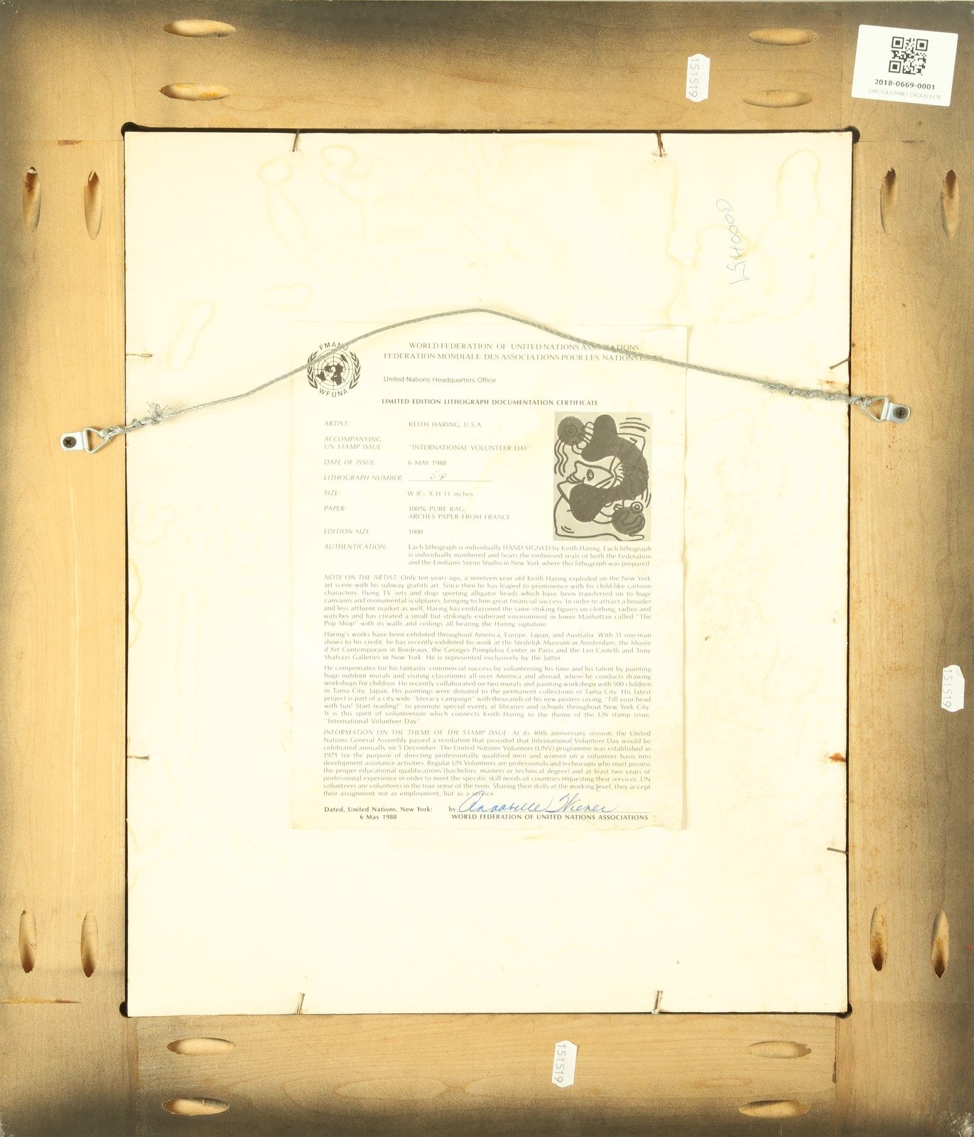 HARING KEITH (1958 - 1990) International Volunteer Day, 1988. 1988. Litografia. Cm 21,50 x 28,00. 518/1000. Tiratura, firma, anno a matita in basso. Timbro a secco Emiliano Sorini in basso a destra. Editore: World Federation Of United Nations Assosiations, New York. Stampatore: Emiliano Sorini Studio, New York. BIbliografia: http://www.haring.com/!/art-work/815#.W7Bv72gzbD4. Cornice presente