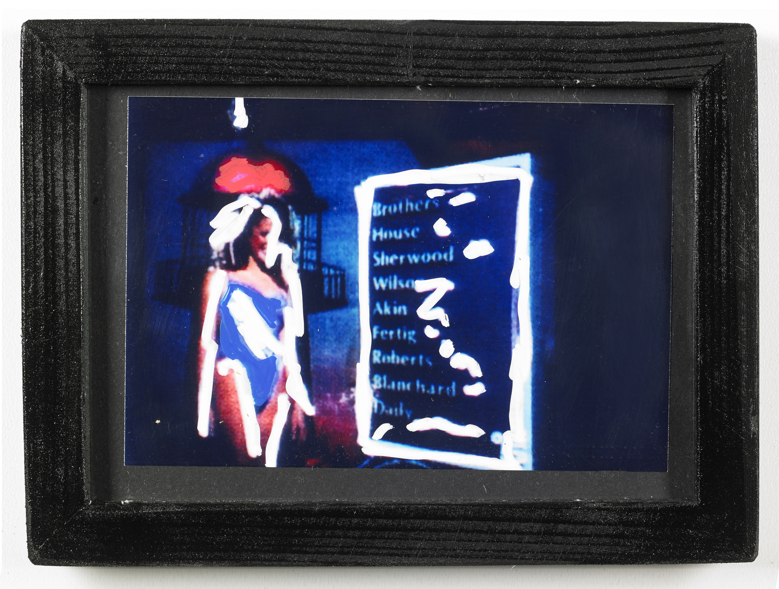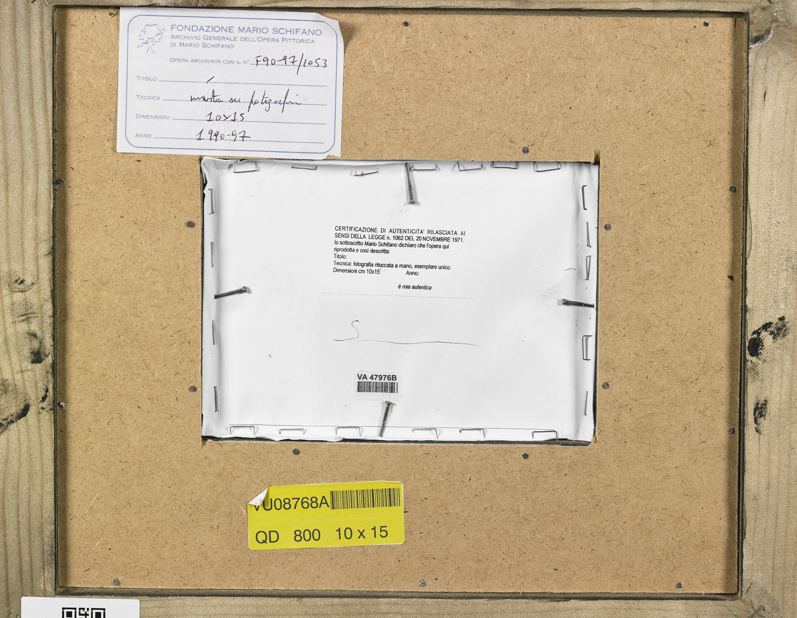 SCHIFANO MARIO (1934 - 1998) Senza titolo. Tecnica mista su fotografia. Cm 15,00 x 10,00. Timbro a secco Schifano in basso a destra. Al retro firma e cartiglio descrittivo Fondazione Multistudio Mario Schifano. Opera archiviata presso la Fondazione Mario Schifano Multistudio in data 10 Ottobre 2007, come da documentazione fotografica allegata all'opera riportante il relativo numero d'inventario. Certificato di autenticità Telemarket, Roncadelle (Bs). 1990-1997. Cornice presente