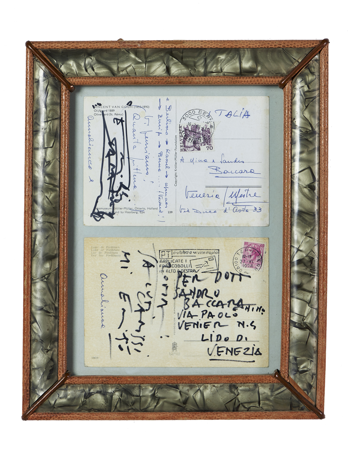 VEDOVA EMILIO (1919 - 2006) Coppia di cartoline. Cartolina. Cm 17,00 x 23,00. Entrambe le cartoline sono firmate. Cornice presente