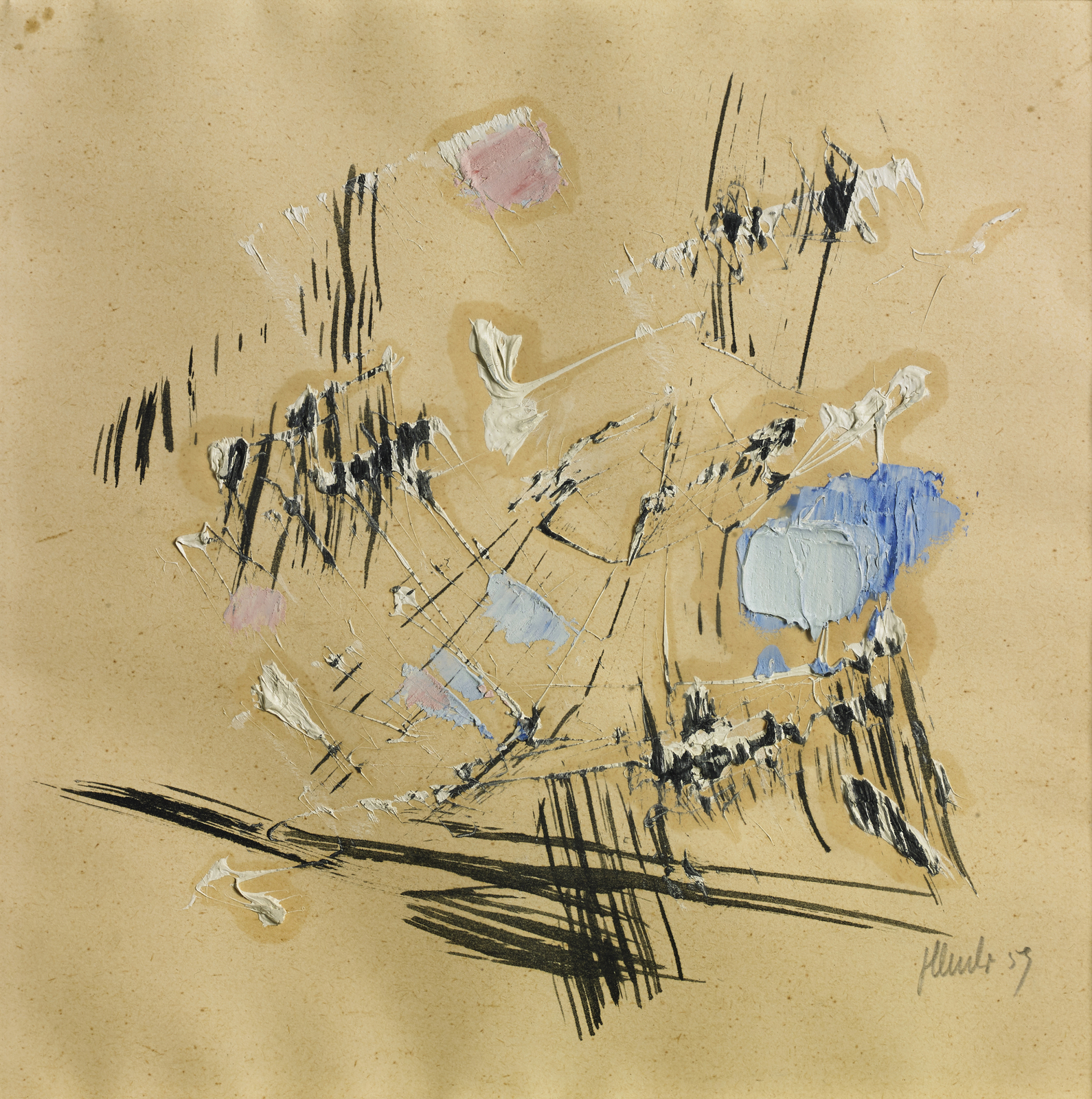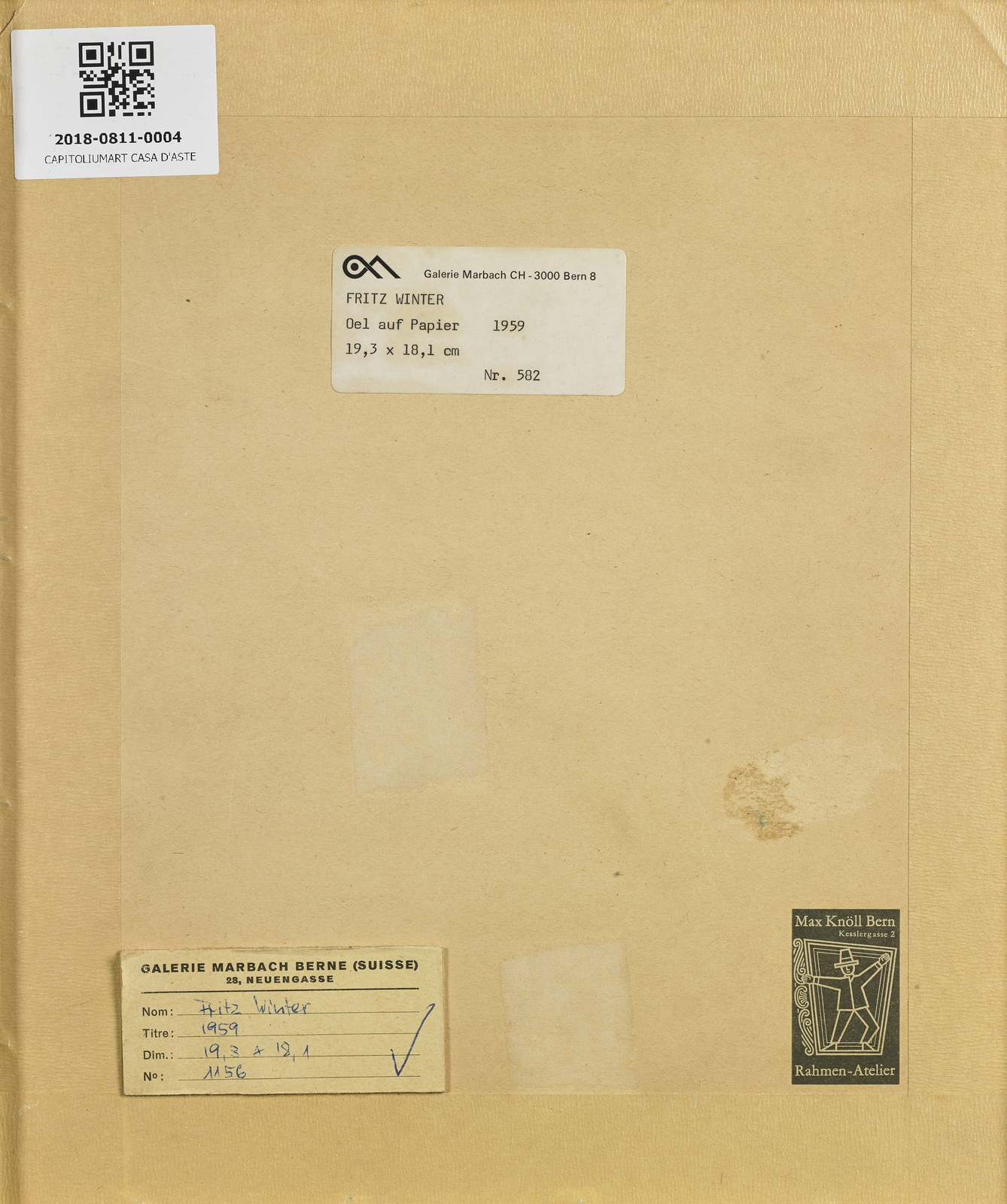 WINTER FRITZ (1905 - 1976) Senza titolo. 1959. Tecnica mista su carta. Cm 19,30 x 18,00. Firma e anno in basso a destra. Al retro cartiglio descrittivo Galerie Marbach. Cornice presente