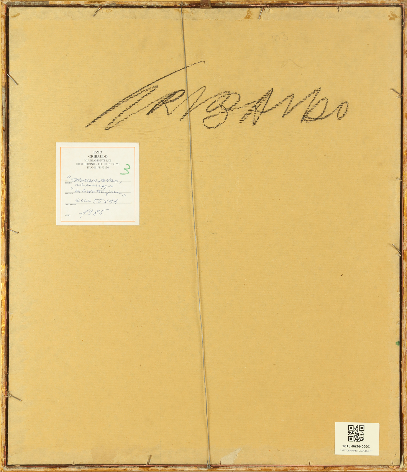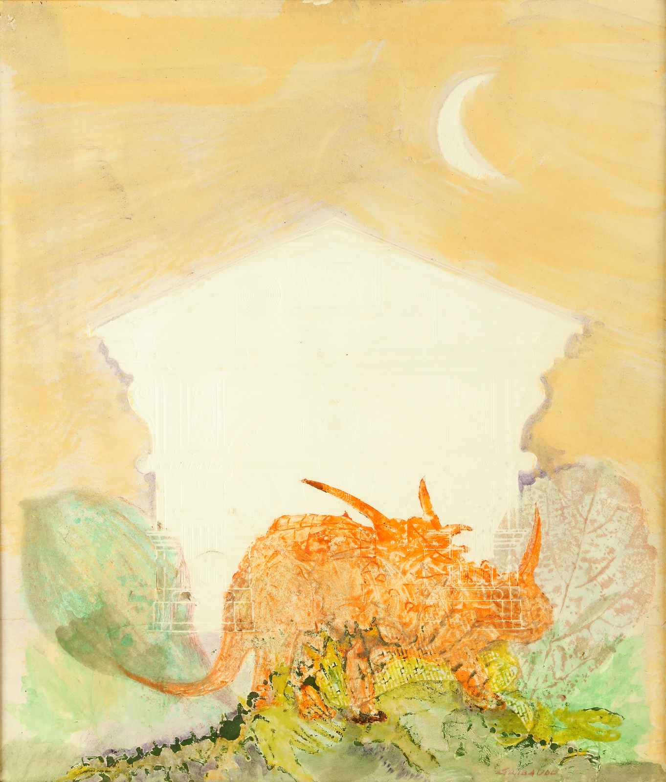 GRIBAUDO EZIO (n. 1929) Tyrannosaurus. 1985. Mixed media on paper. Cm 46,00 x 55,00. Signature lower right. At the back artist's label. Cornice presente