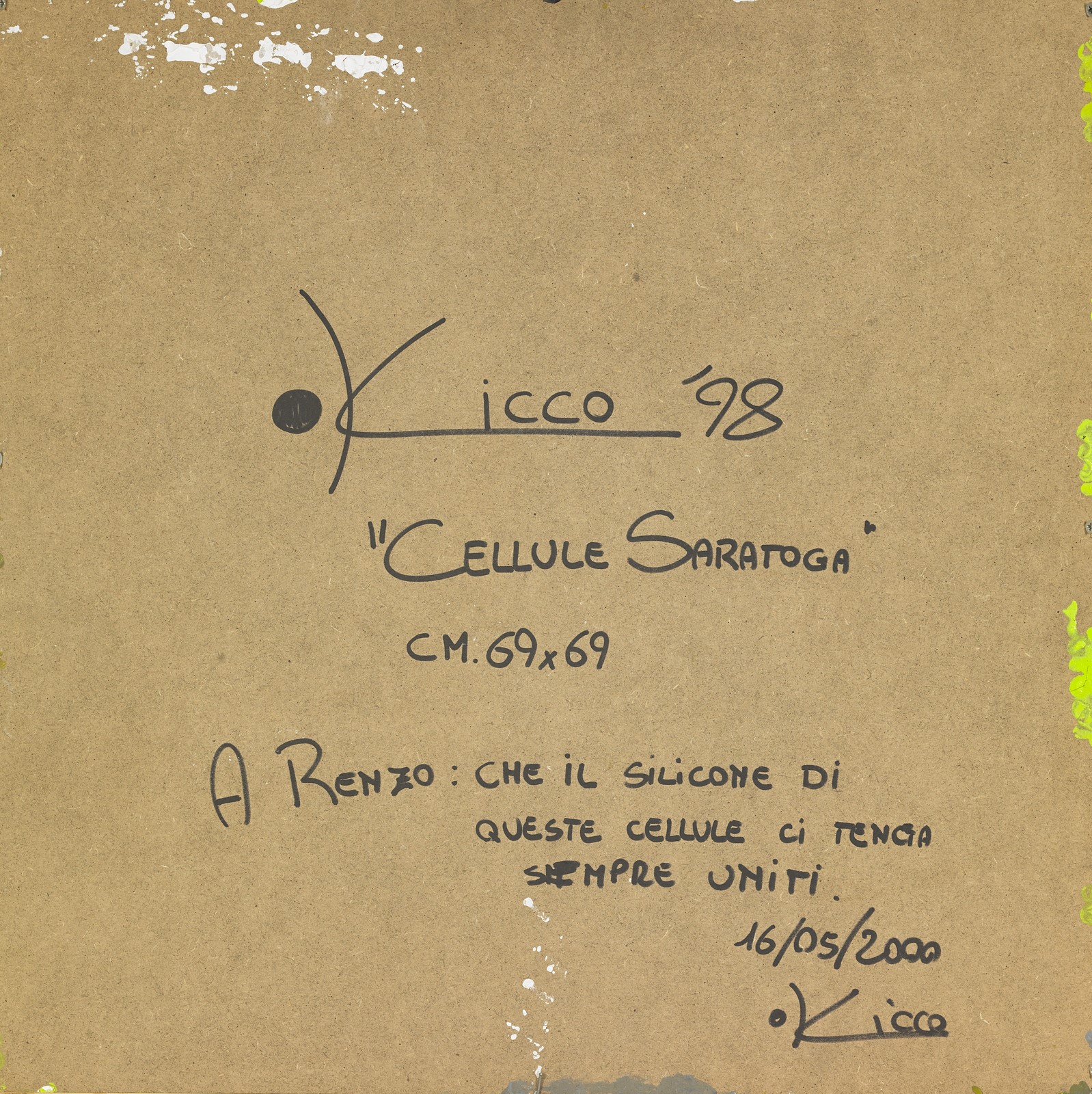 KIKKO (n. 1969) Cellule Saratoga. 1998. Tecnica mista su tavola. Cm 69,00 x 69,00. Al retro titolo, firma e anno. Cornice presente