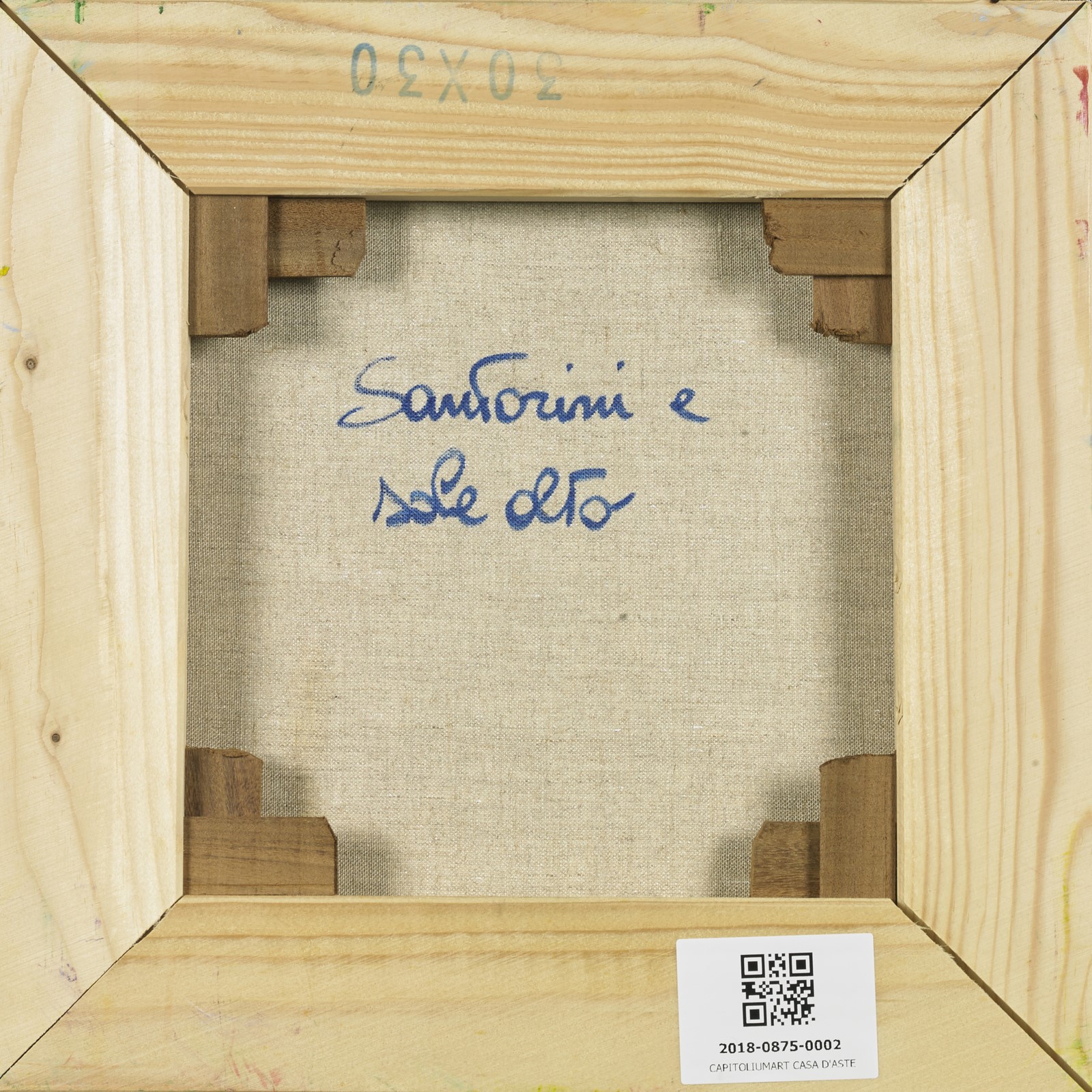 FACCINCANI ATHOS (n. 1951) Santorini e sole alto. Olio su tela . Cm 30,00 x 30,00. Firma in basso a destra. Titolo al retro. Autentica dell'artista su fotografia.