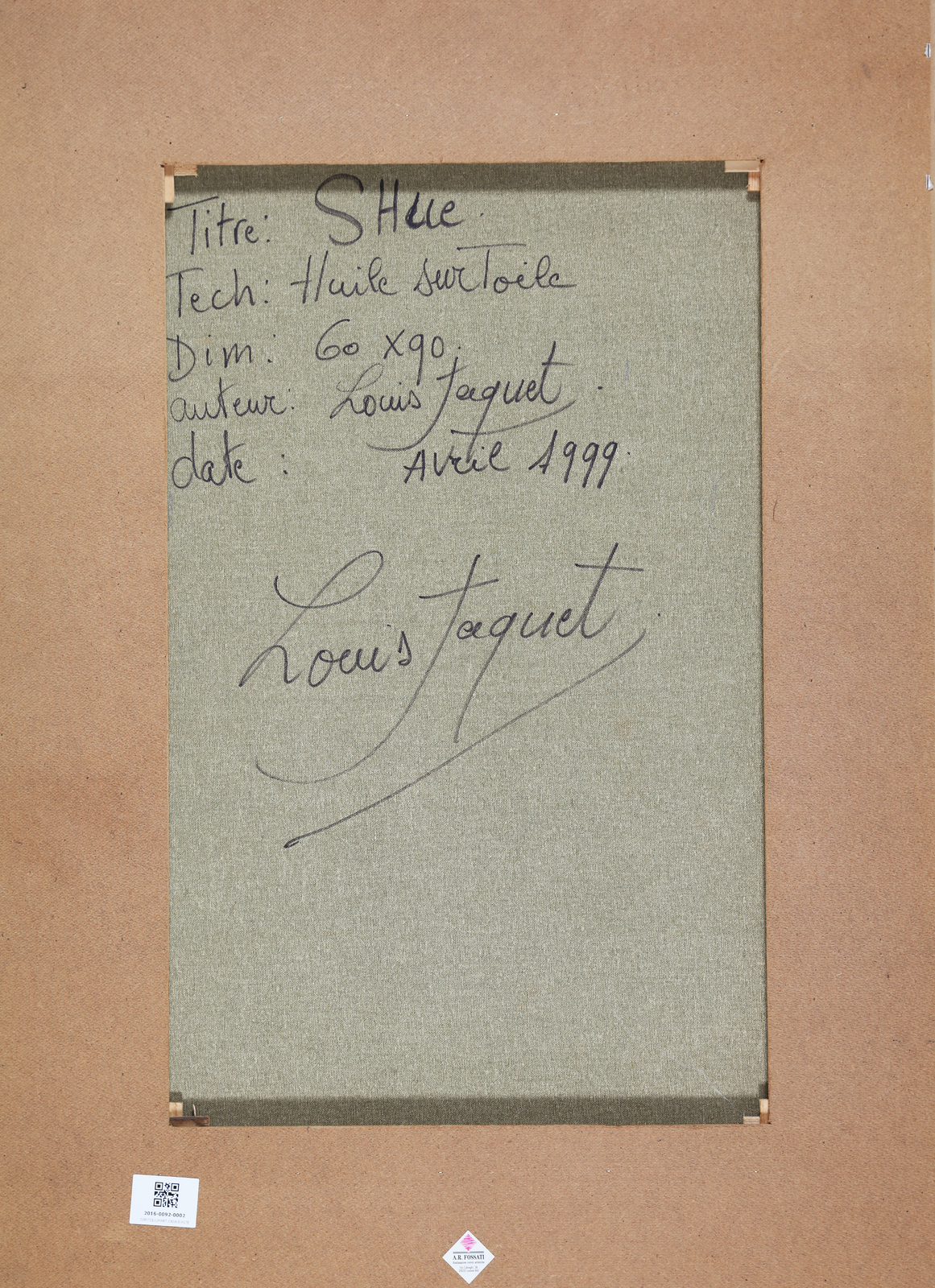 JAQUET LOUIS (n. 1944) Shue. 199. Olio su tela . Cm 60,00 x 90,00. Firma in basso a sinistra. Al retro titolo firma e anno. Pubblicazioni: Louis Jaquet, Edizioni D'Arte Ghelfi, Verona, pag. 131. Cornice presente