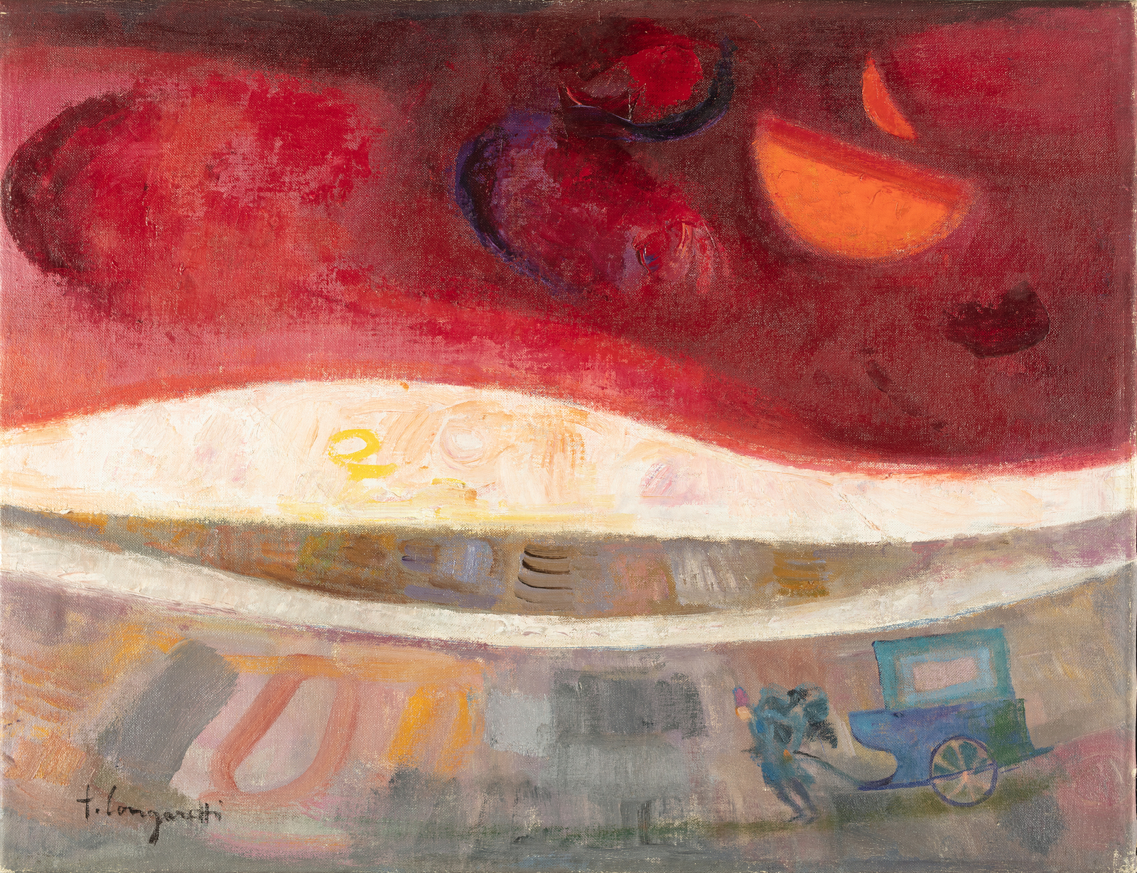 LONGARETTI TRENTO (n. 1916) Fantastic landscape with white hill. 1985. Oil on canvas . Cm 60,00 x 50,00. Signature lower left. At the back title, year and Ponte Rosso Gallery label. Artist's authenticity certificate with Ponte Rosso Gallery stamp. Cornice presente