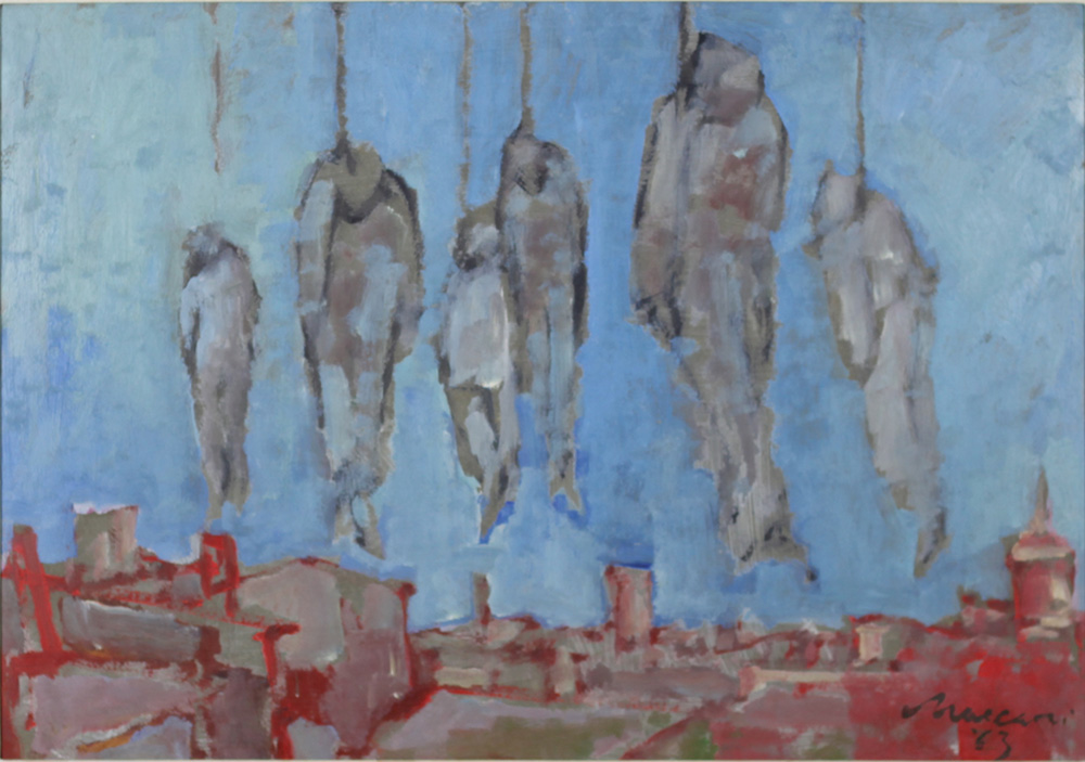 MINO MACCARI, Impiccati alle nuvole, Olio su cartone Anno 1963 Dim.50x71,8 Opera Archiviata Opera Pubblicata Datato e firmato in basso a dx
