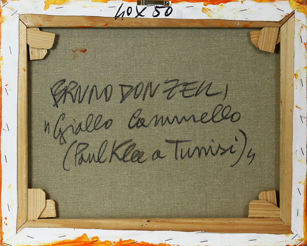 BRUNO DONZELLI, Giallo cammello "Paul Klee a Tunisi", Olio e tecnica mista su tela Dim. 40x50 Opera senza cornice Autentica su foto dell'artista Al verso titolo, dimensioni e firma Firmato in basso a dx
