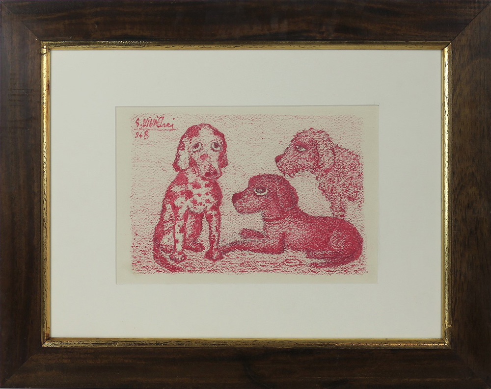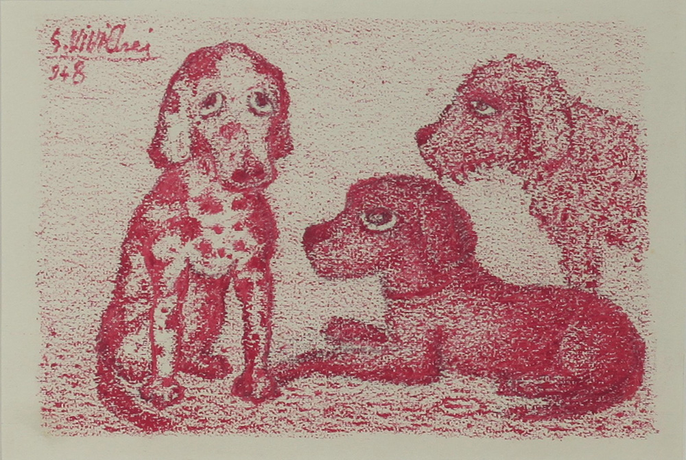 GIUSEPPE VIVIANI, Cani sulla spiaggia, Matite dermografiche su cartoncino Anno 1948 Dim.24,5X35 Archivio Saletta d'Arte Viviani Pisa al Numero 02191214/S.G. Datato e firmato in alto a sx