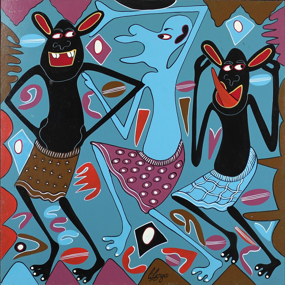 GEORGE LILANGA, Usicheke ukazani mimi nakutania, Acrilico su masonite Dim....
