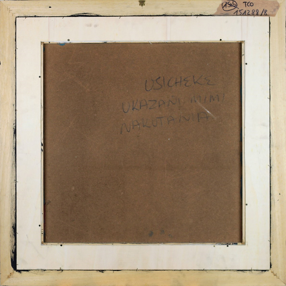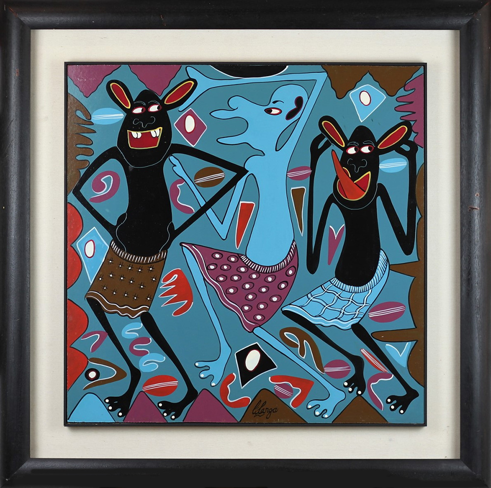 GEORGE LILANGA, Usicheke ukazani mimi nakutania, Acrilico su masonite Dim. 62x61 Al verso titolo Firmato in basso al centro