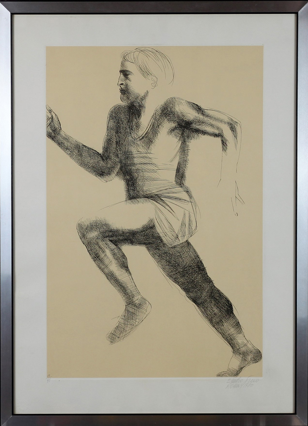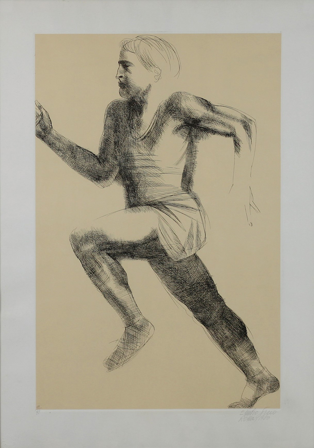 EMILIO GRECO, L'arrivo, Acquaforte originale Anno 1980 Dim. 57x38 Esemplare 19/99 Certificato di autenticità e di provenienza Galleria d’Arte Gissi su carta Opera pubblicata su Catalogo Olimpiade edito da Espolito Torino Tiratura in basso a sx Timbro a secco in basso a sx Datato e firmato in basso a dx