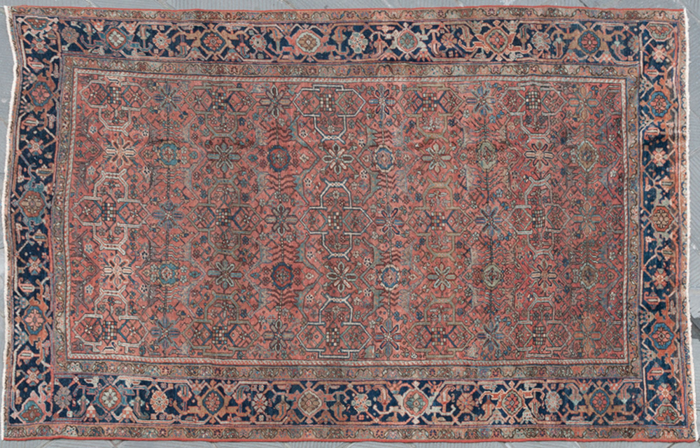 Heriz, Senza titolo, Misure cm 316x233 Heriz dei primi del ‘900 La piccola città di Heriz nell’Azerbaijan persiano è stato nel XIX sec. Un’importante protagonista nella tessitura dei tappeti di grandi dimensioni per il mercato euro-americano. Caratteristica fondamentale dei tappeti di quest’area è il deciso geometrismo con cui venivano schematizzate le classiche decorazioni floreali persiane. Quelli più ricercati non hanno medaglione centrale