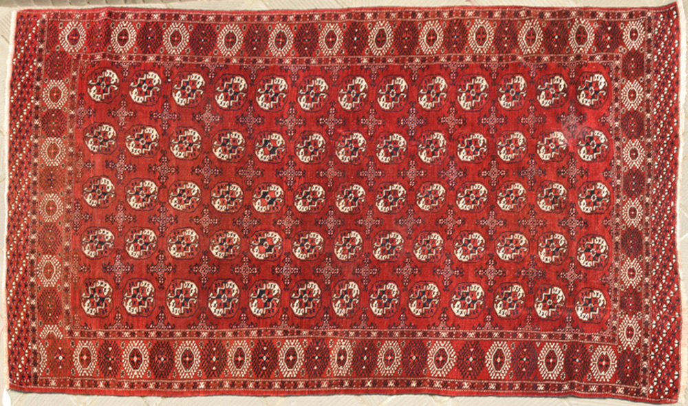 Bukara russo, Senza titolo, Misure cm 322x220 Bukara russo Esemplare Tekke con tre file di ghol, di densa ornamentazione. Anche la decorazione della bordura è armoniosa, con colori e disegni molto preziosi. Buone le condizioni in relazione all’età. Magnifico esemplare da collezione.