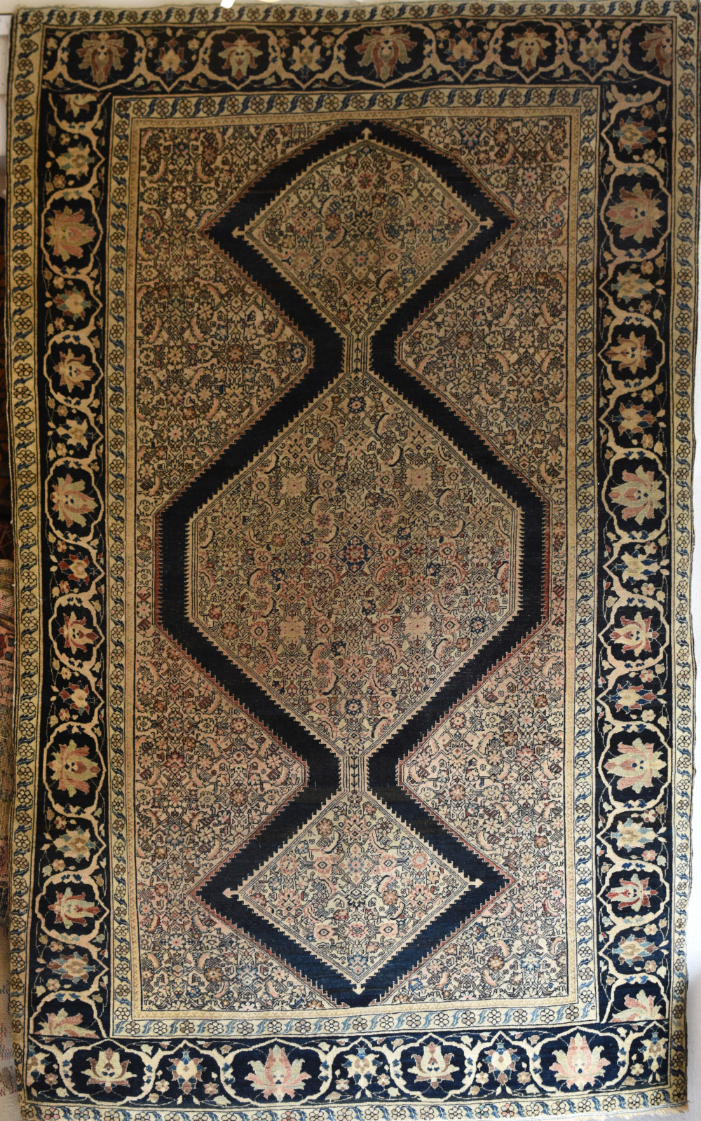 Ferahan, Senza titolo, Misure cm 196x124 Ferahan Ferahan ha avuto un grande diffusione in Europa dove furono apprezzati per la sobrietà ed eleganza del disegno per lo più costruito ripetendo elementi decorativi semplici. Lana Kork. Robusta struttura in cotone. Il nodo più usato è l’asimmetrico, densità di nodo elevata. Lana soffice rasata molto bassa che dona un aspetto vellutato. Il motivo di questo esemplare è Herati