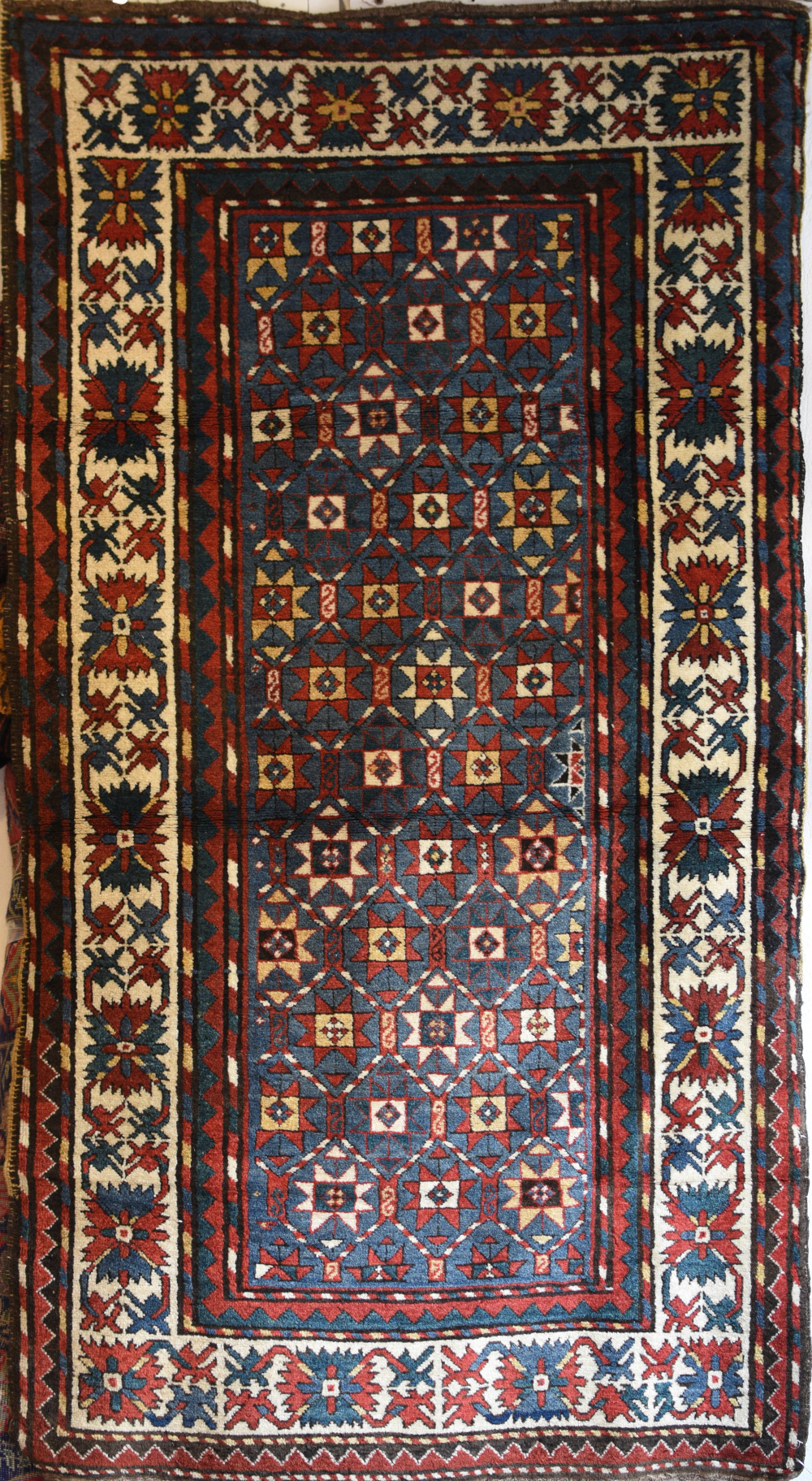 Kazak, Senza titolo, Misure cm 201x107 Kazak Tipico Esemplare dell’altopiano del Caucaso, vello alto, talvolta scomposto. Densità variabile da media a grossa. Grandi ornamenti geometrici e motivi vagamente grossolani. Colorazione intensa con lana brillante e grezza. Ogni tappeto è diverso dagli altri:pezzi unici concepiti al di fuori di ogni regola e precisione, forse è proprio per questo che oggi sono oggetto di ricerca da parte dei collezionisti e i loro prezzi alle aste volano alle stelle. Disegno vigoroso ed espressivo, attraverso la sua fedeltà alla tradizione trasmette un senso di quiete e di essenzialità. Importare bordura bianca. Oltre ad originalità del disegno e colorazione, sta nel suo impeccabile stato di conservazione. Il vello, mantenutosi fortunatamente su tutta la superficie, sembra non essere mai stato calpestato.
