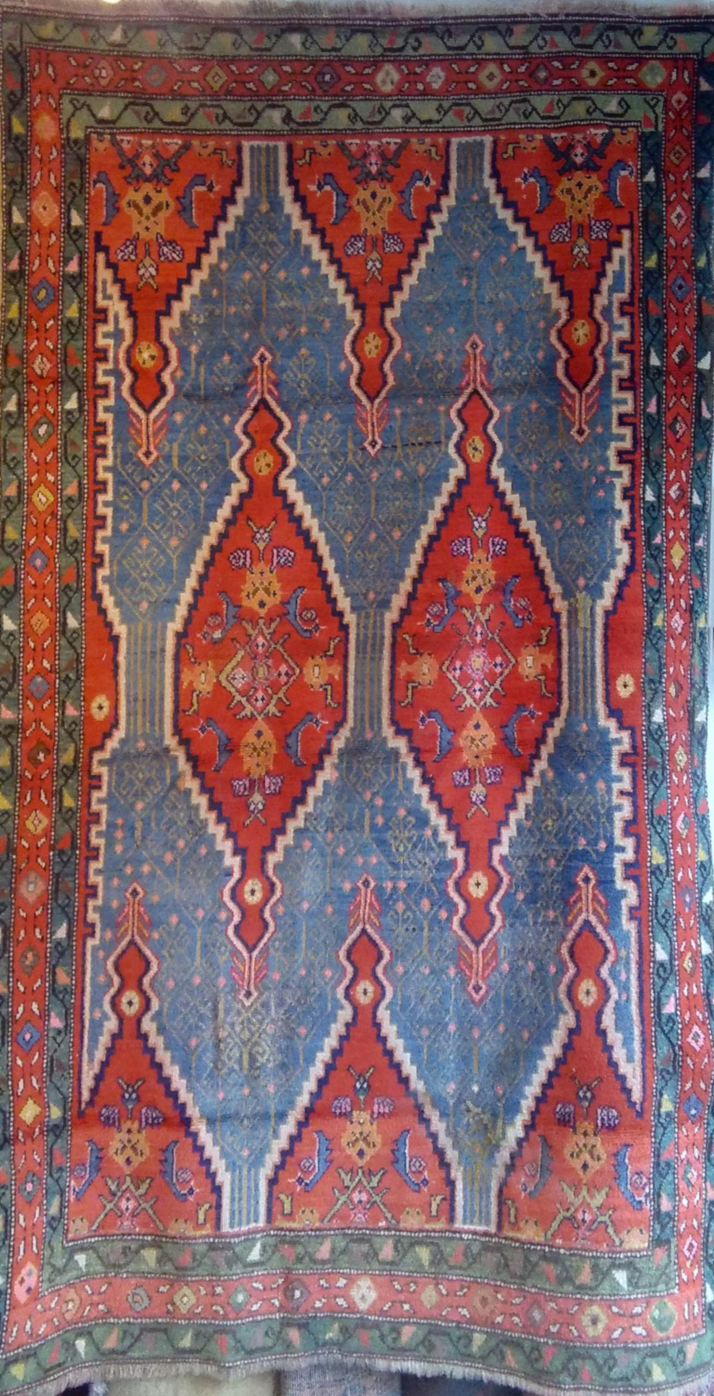Caucaso Karabak, Senza titolo, Misure cm 216x114 Caucaso Karabak Distretto azerbaigiano, ricco di villaggi attivi nella tessitura. Quando si parla di tappeti caucasici si indicano tappeti realizzati nelle aree a sud, est e nord della catena montuosa del Caucaso.Vi furono prodotti, durante l’ottocento, tappeti floreali per il gusto francese. Sono tappeti caratterizzati da motivi geometrici abbinati a motivi floreali ricchi e fantasiosi. A volte si trovano figure di animali o mostri stilizzati.