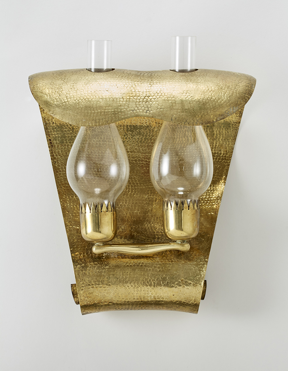Wall lamp model "158". Produced by Arteluce, Milan, 1938-1942. Lantern diffusers in colorless transparent glass. Reflective support in bent and shaped brass sheet finished by hammering on a sand-filled cushion. (32.5x35.5x17.5 cm.) (slight defects and restoration)
