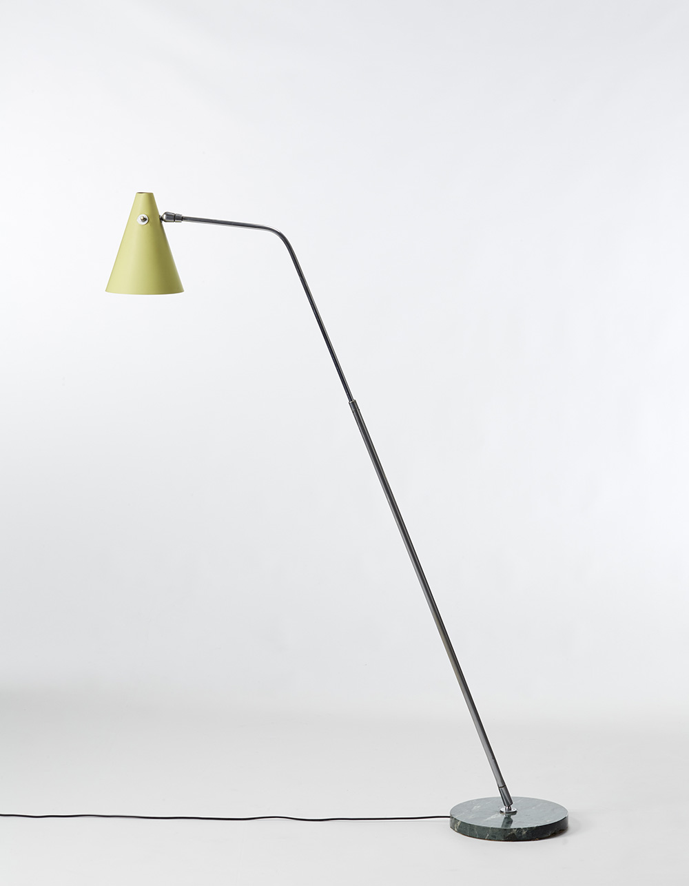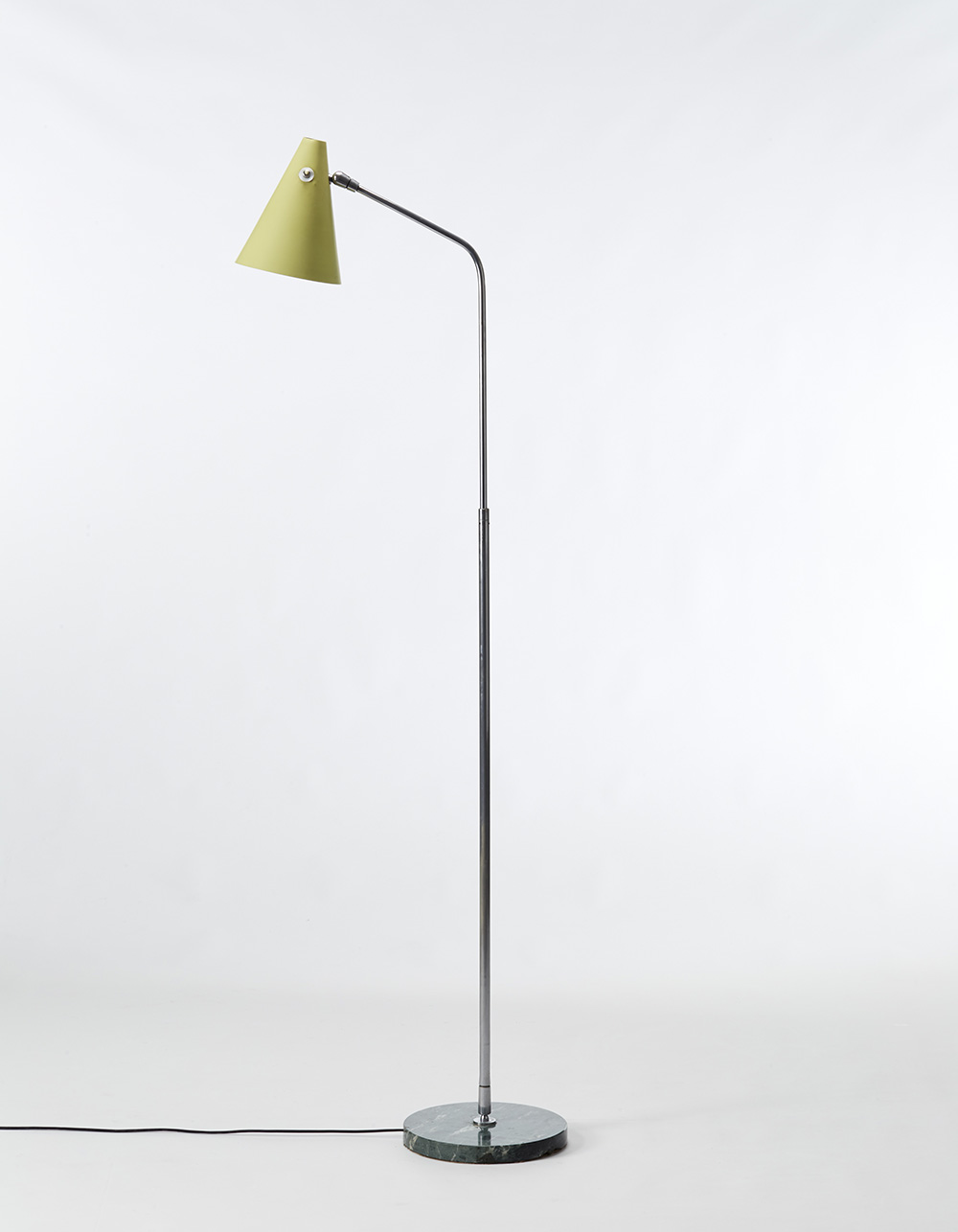 Lampada da terra ad altezza regolabile. Produzione O-Luce, Milano, anni '50. Struttura in tubolare metallico cromato, base cilindrica in marmo verde venato, paralume troncoconico in alluminio laccato color vaniglia e bianco. (h max cm 165) (lievi difetti)