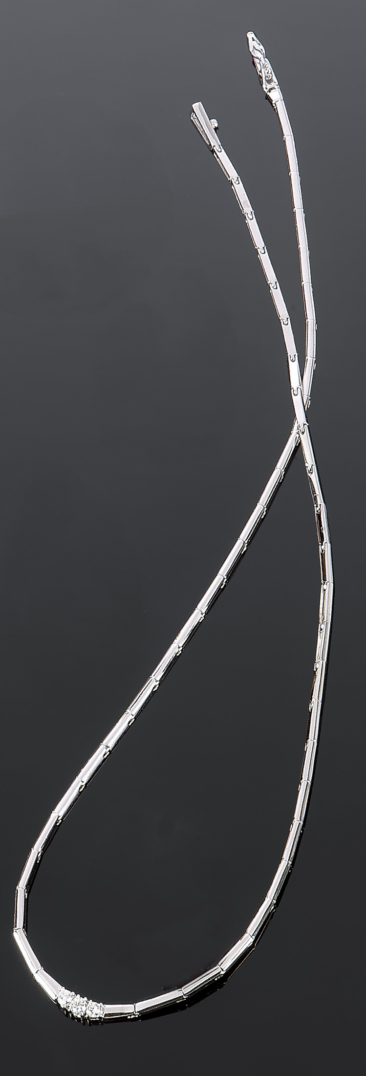 GIROCOLLO Girocollo in oro bianco composto da segmenti successivi, al centro tre diamanti taglio brillante rotondo per complessivi ct 0,40 ca, colore G, purezza IF Peso gr. 12,00