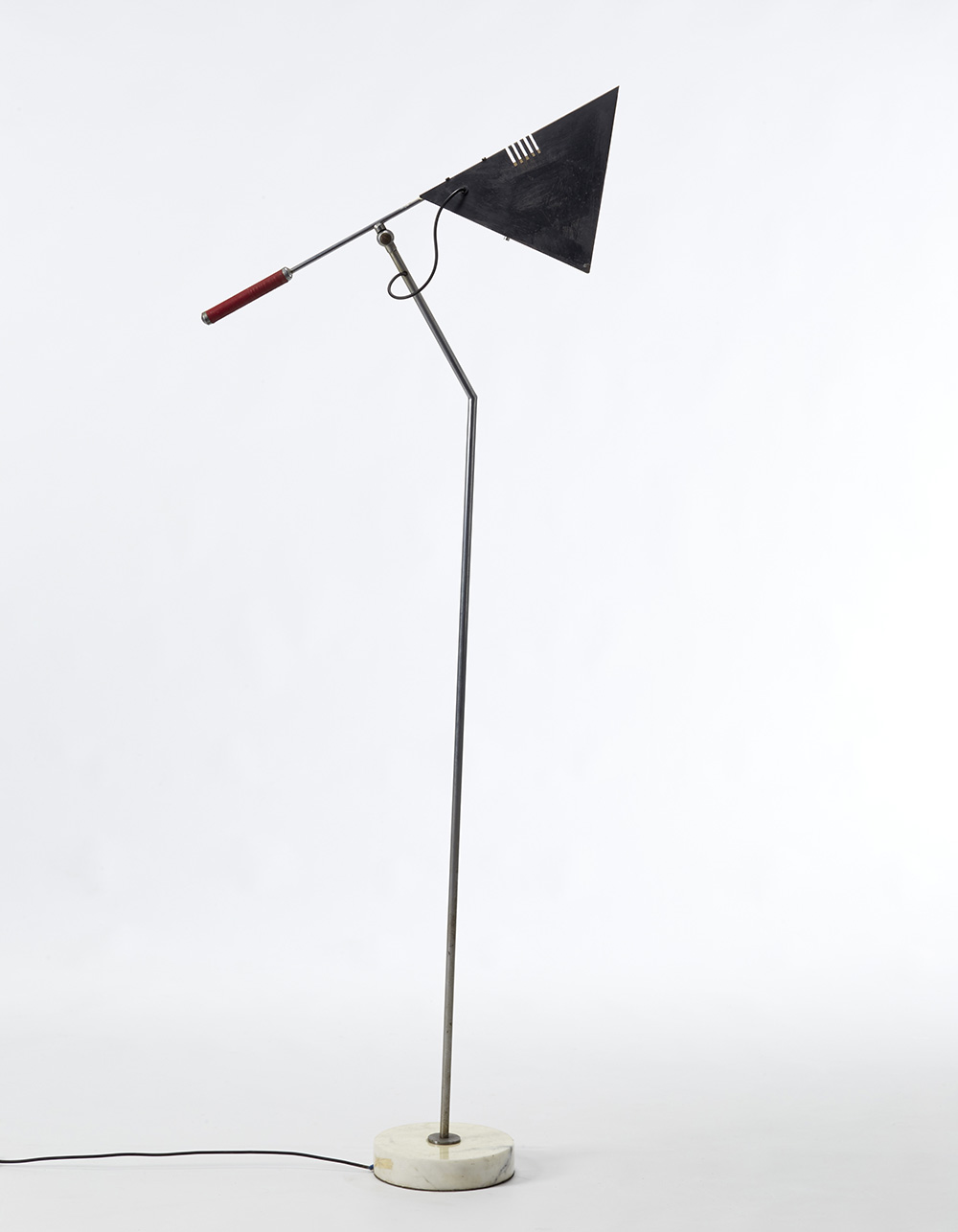 Lampada da terra orientabile con struttura in tubolare e tondino di metallo cromato, base cilindrica in marmo di Carrara, paralume in alluminio verniciato nero e bianco, diffusore in perspex opalino. Manico rivestito in pelle rossa. Italia, anni '50. (h cm 156) (lievi difetti)