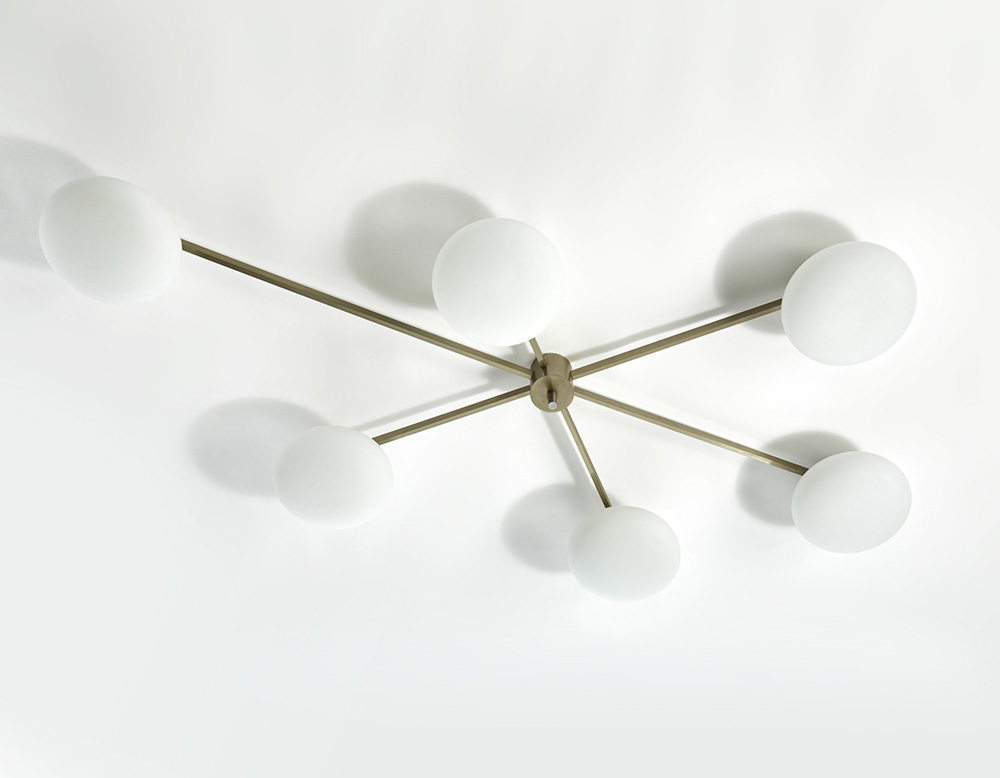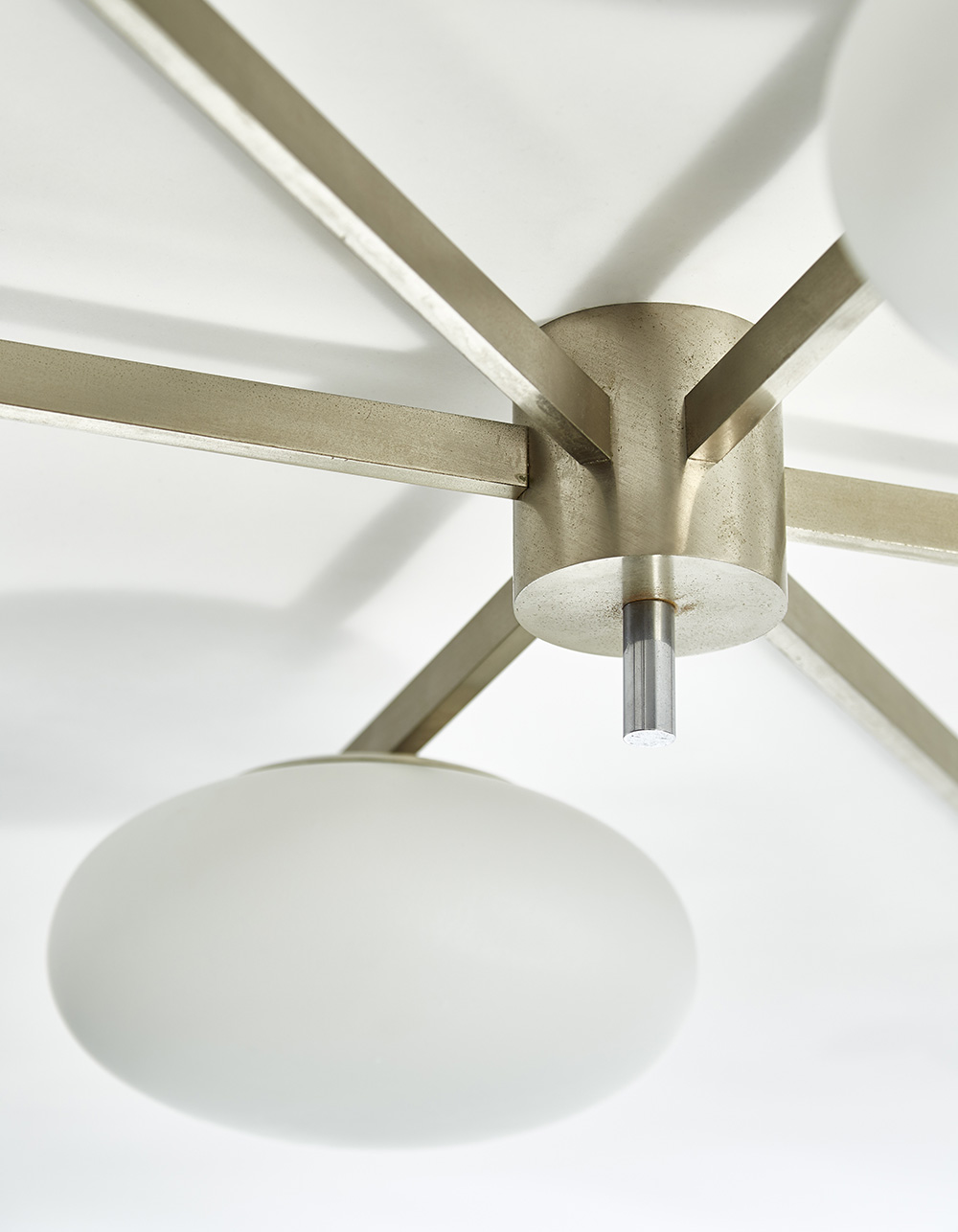 Lampada a plafone a sei luci modello "6 lune". Esecuzione Arredoluce, Monza, 1961ca. Struttura in ottone nichelato, portalampade in metallo laccato bianco e diffusori in vetro incamiciato duplex opal satinato sulla superficie esterna. (l cm 190)