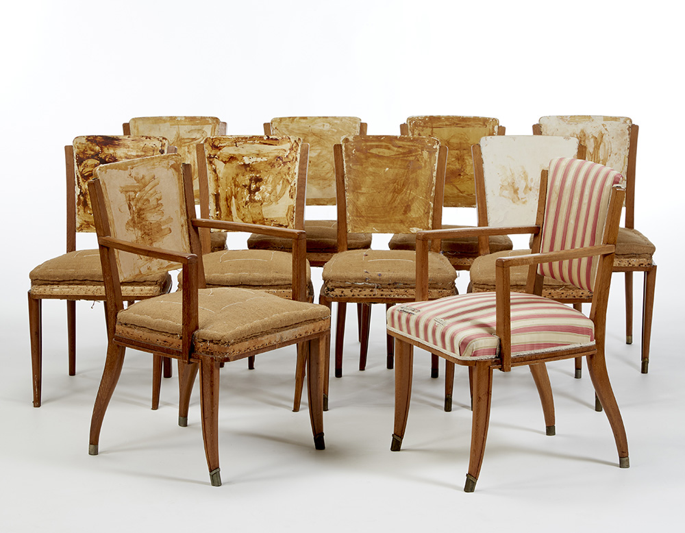 Otto sedie e due capitavola Art Déco. Esecuzione Atelier E. J. Ruhlmann, Parigi, 1931. Legno massello di rovere sagomato e profilato, puntali in bronzo argentato. Mancanti del tessuto di rivestimento ad eccezione di un esemplare. (sedie: cm 48x86x56,5; capitavola: cm 57,5x91x62,5) (difetti, restauri e mancanze)