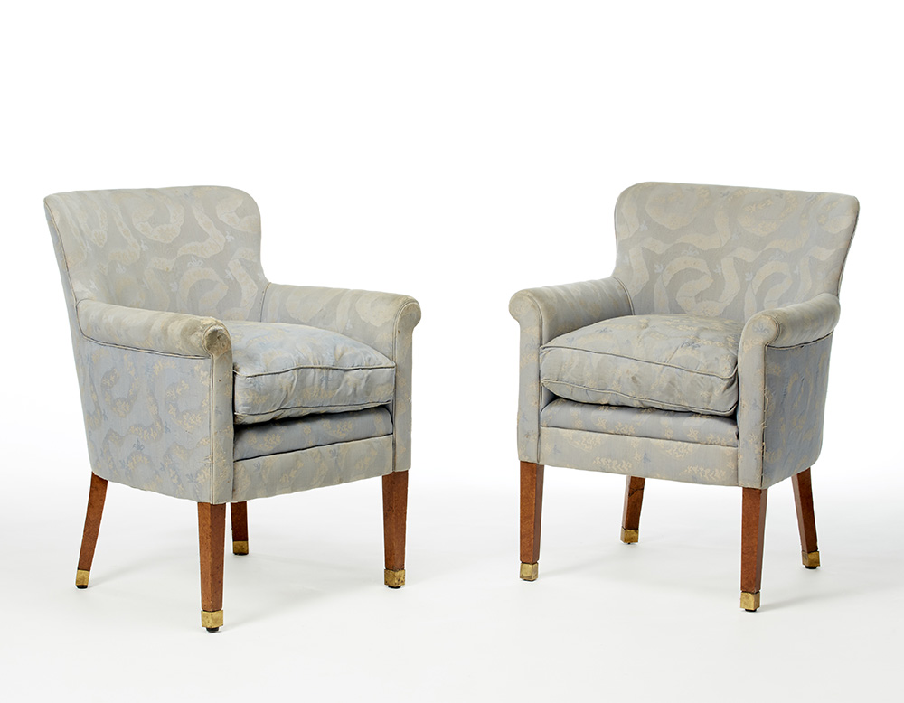 Coppia di poltrone con gambe alte e puntali in ottone nello stile di...